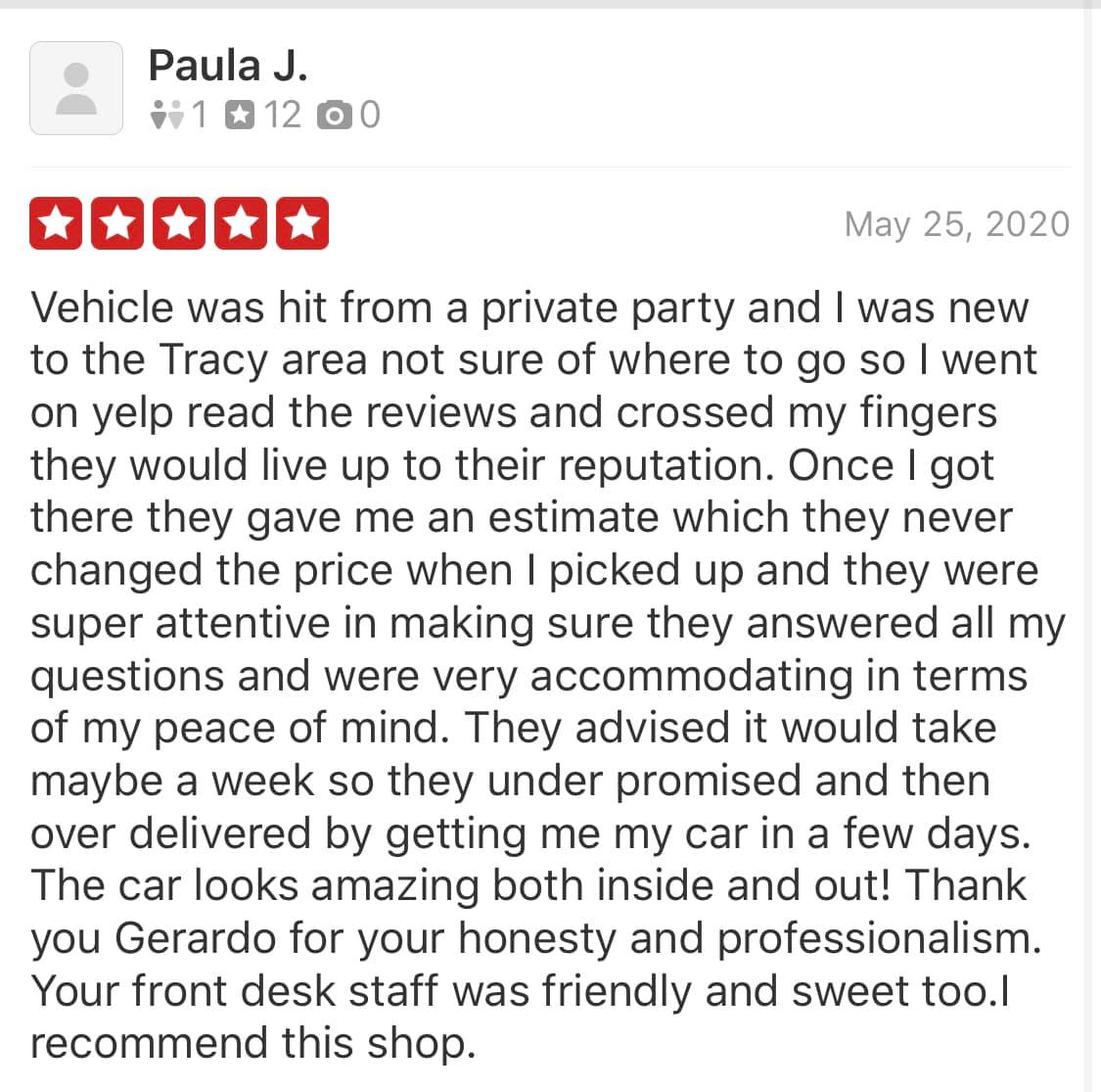 Gerardo Ceja and all of his crew/team have done a very professional repair work on my Toyota Sequoia . I would recommend Gerardo's bodyshop to my relatives and friends .