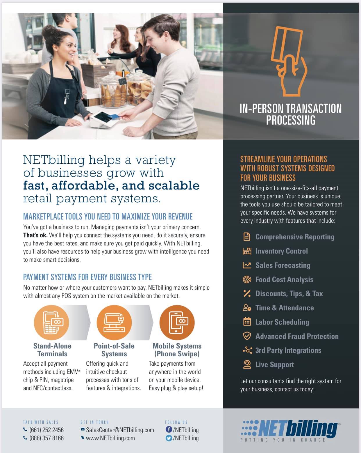 NETBILLING MAKES IT EASY TO ACCEPT CREDIT/DEBIT CARDS, ACH, AND MUCH MORE! We offer a variety of industry-leading affordable solutions, including our popular "Zero-Fees Cash Discount Program", plus world-class customer support! NETbilling goes beyond simple transaction processing. We provide merchant accounts, a world-class payment gateway, plus a wide selection of point-of-sale terminals and ISV payments integrations. Our services are available for most business types including: Retail, Restaurants, Recurring Memberships, Tangible Products, Service Industries, Healthcare, Travel, Gaming, CBD, Adult, Dating, Plus Many Other Mainstream and High Risk Businesses. NETBILLING: SEAMLESS PAYMENTS, LIMITLESS GROWTH.