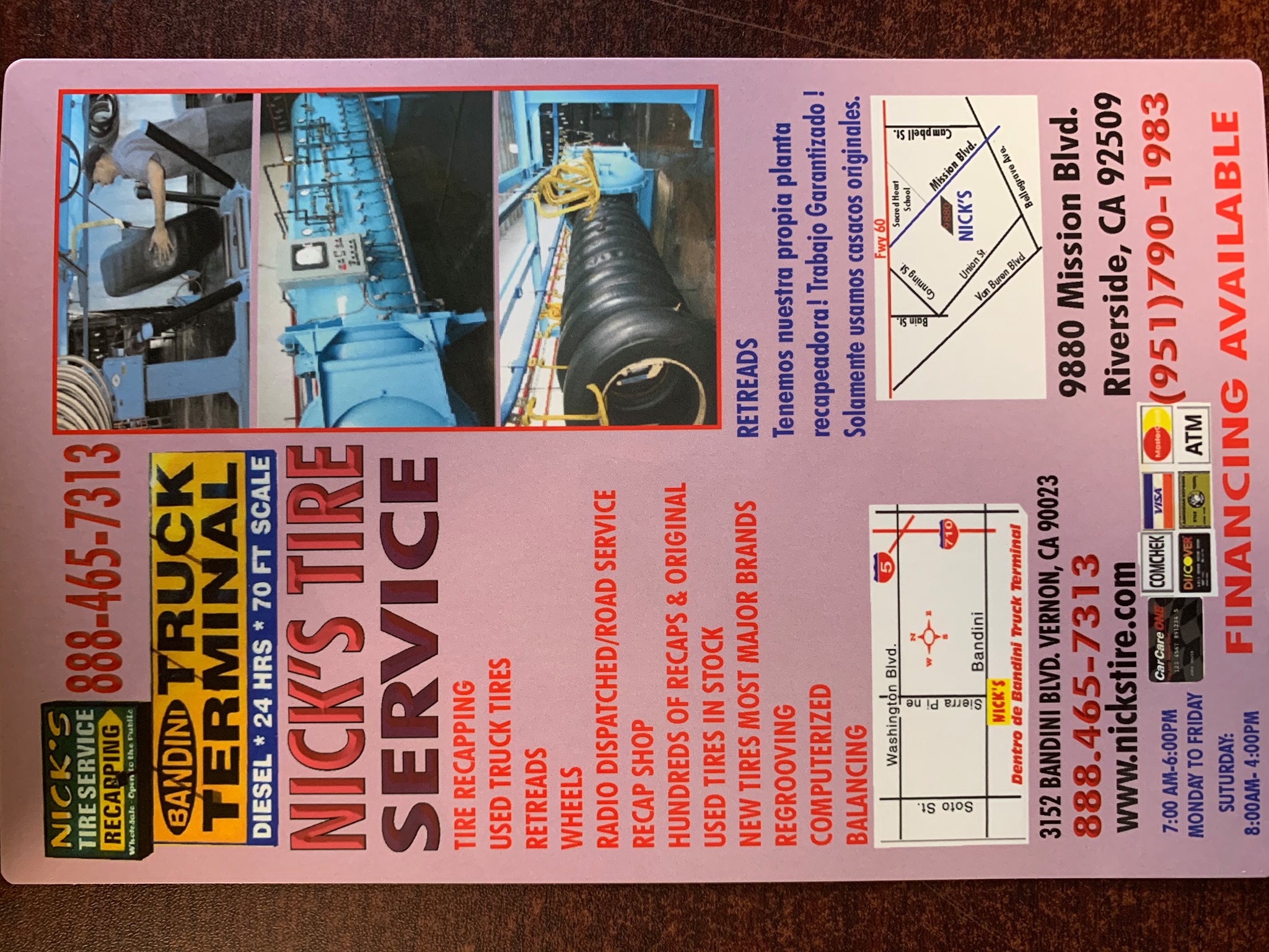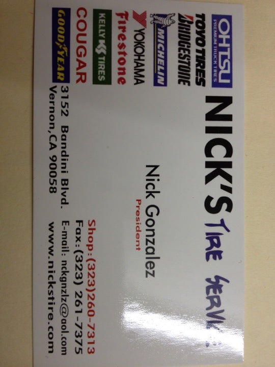 Nick's Tire Service, Inc. is a nice, efficient, and warm place, described as the hidden gem of SoCal. It provides excellent service with a fast response time and offers mobile service for the local area. The shop specializes in new and used tires and wheels for semi trucks and full-sized trucks, including American brands, but does not service small cars. Customers report being helped quickly, even during late evenings, and getting work done at a reasonable price, often for much less than competitors. The team is known for going above and beyond, offering helpful service without always charging. It is highly recommended for anyone in the Los Angeles area needing tires, wheels, or service for larger vehicles.