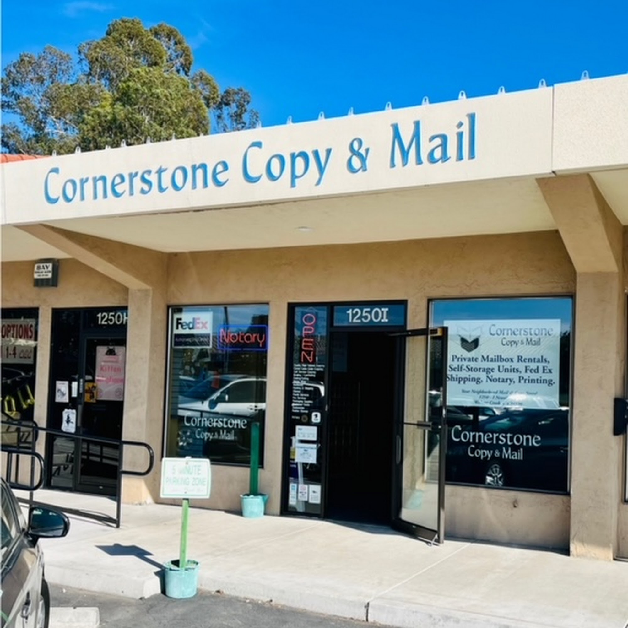 Cornerstone Copy & Mail is a locally owned mail and copy shop offering Fed Ex, USPS, private mail box rentals, self storage units, printing, notary etc. Customers note friendly helpful service in a clean attractive store in the neighborhood. The manager and owner often go above and beyond, arriving early to start large print jobs and have them ready in time, showing kind and conscientious care. Shipping is simple and easy; staff cover shipping labels with transparent tape to keep them legible even if water gets on them. Phone calls receive knowledgeable answers and latest pick up times. Many describe the experience as pleasant, fantastic and highly recommend this location, giving six stars for excellent customer service.