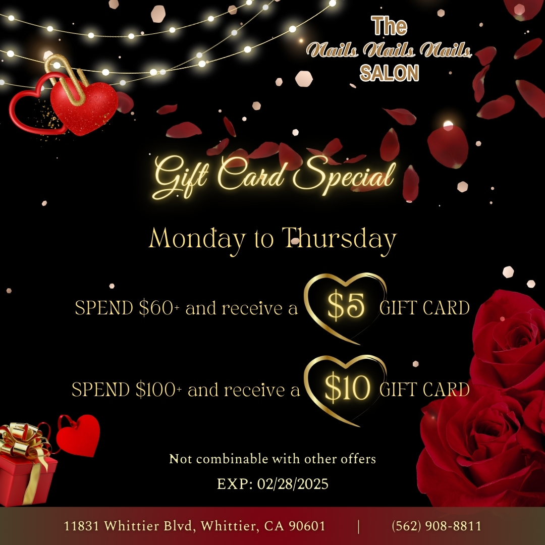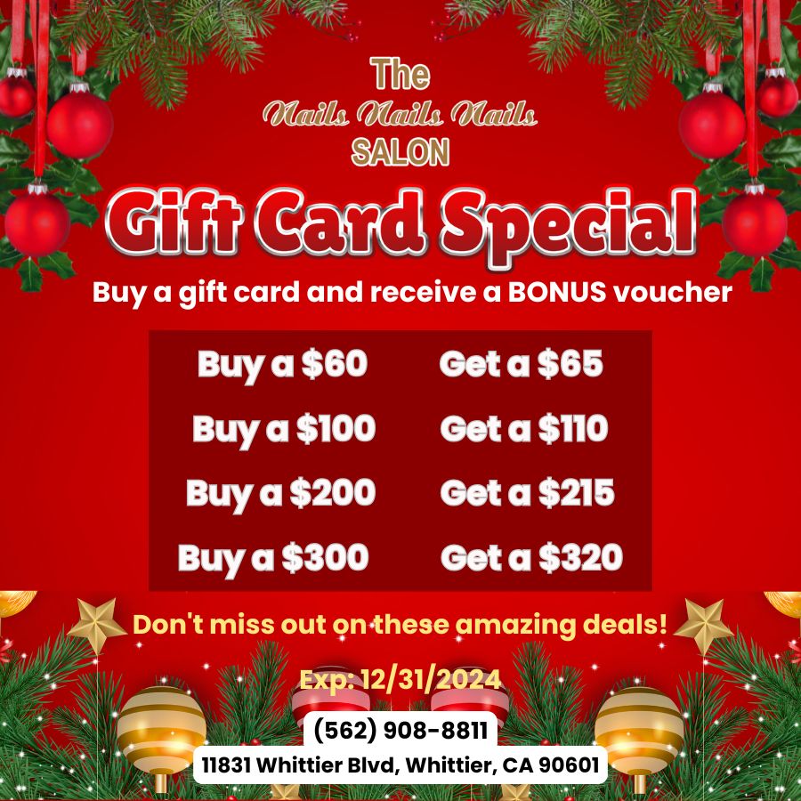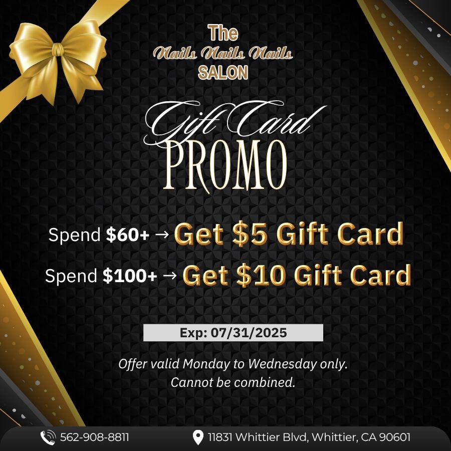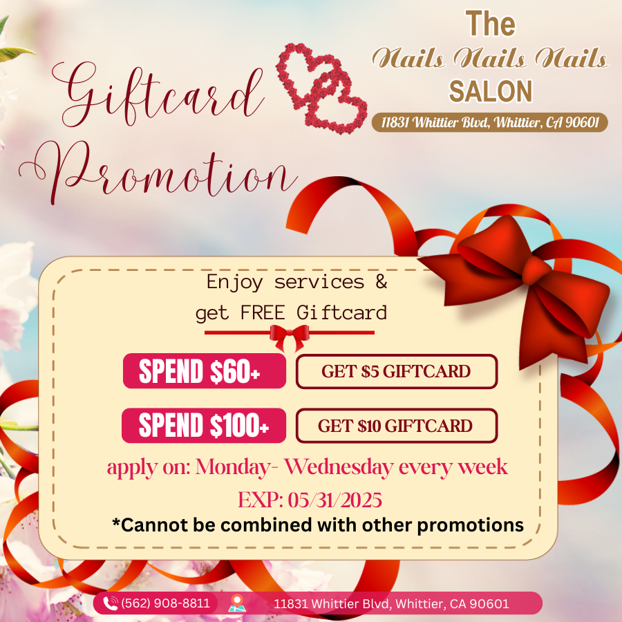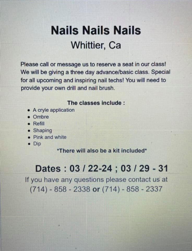 Nails Nails Nails is a top-notch nail salon in Whittier, CA 90601. Our nail salon is the most affordable and professional. We focus on our customer safety, needs, and satisfaction. When walking through our door, you would be pampered carefully by the well-trained, enthusiastic, and whole-hearted staff. Come visit our nail salon, we offer a variety of services for you to choose from such as Manicures, Pedicures, and Waxing. The products that we use are all the best and have high quality from famous and trusted manufacturers in the beauty industry. Come to us now and enjoy the wonderful atmosphere! We are ready to serve you!