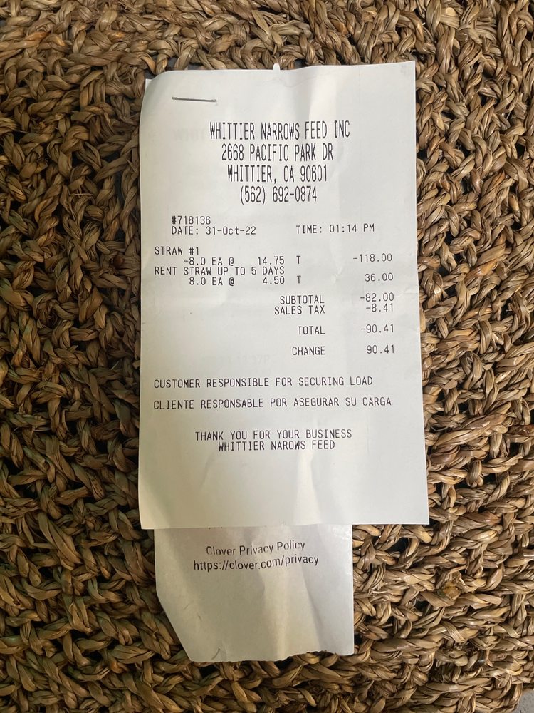 Whittier Narrows Feed is a great place for feed supplies, with everything you need for your feed needs and lots of grains. It is the place you need when looking for hay rentals, with stacks of straw and bales of hay available for rent at great and reasonably priced rates. The rental service is amazing for party props and event decor. They have amazing service and friendly staff, with helpful customer service that will load and unload your truck. Their food is so good for your animals. It is a wonderful place that brings back great memories.
