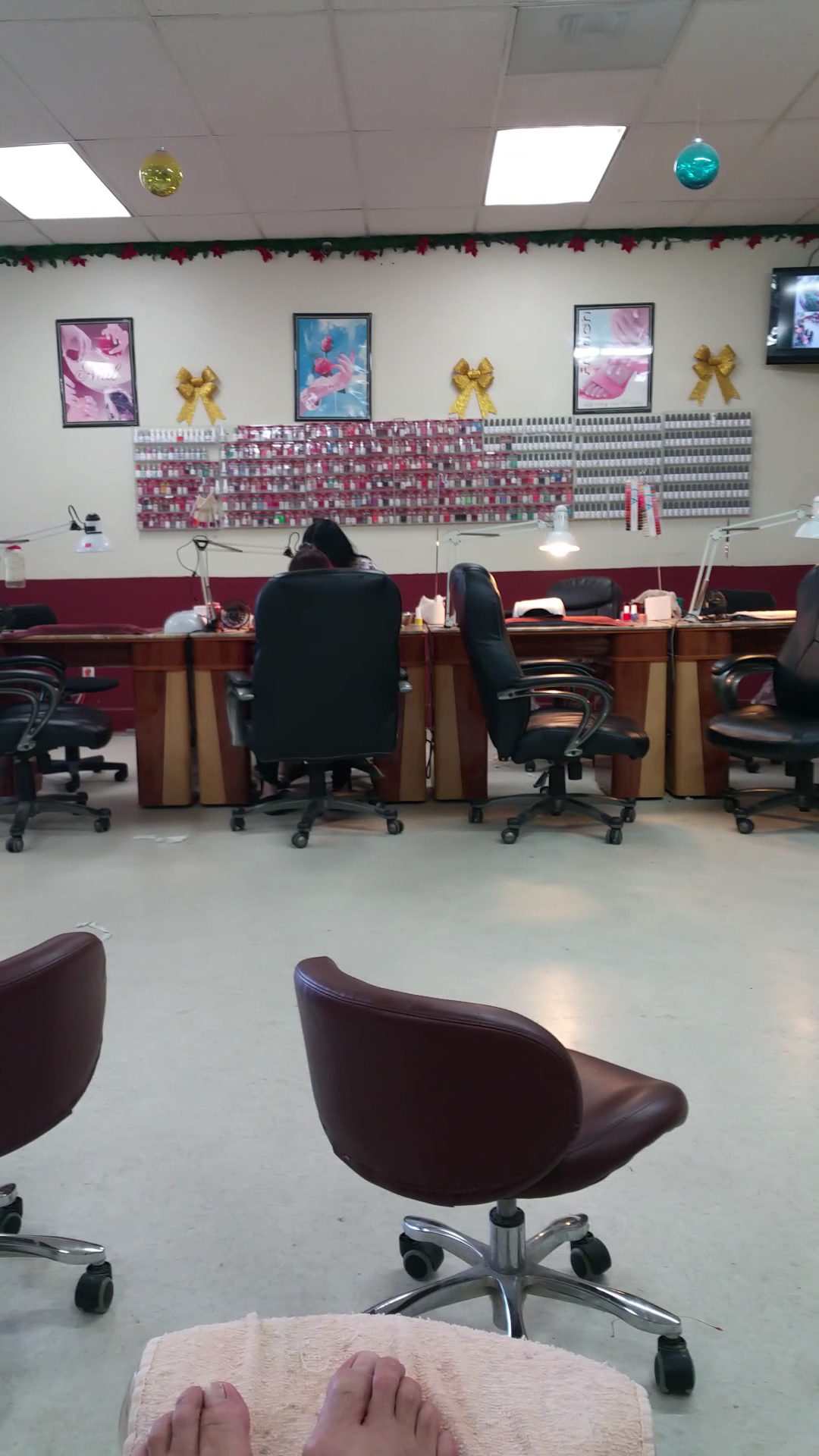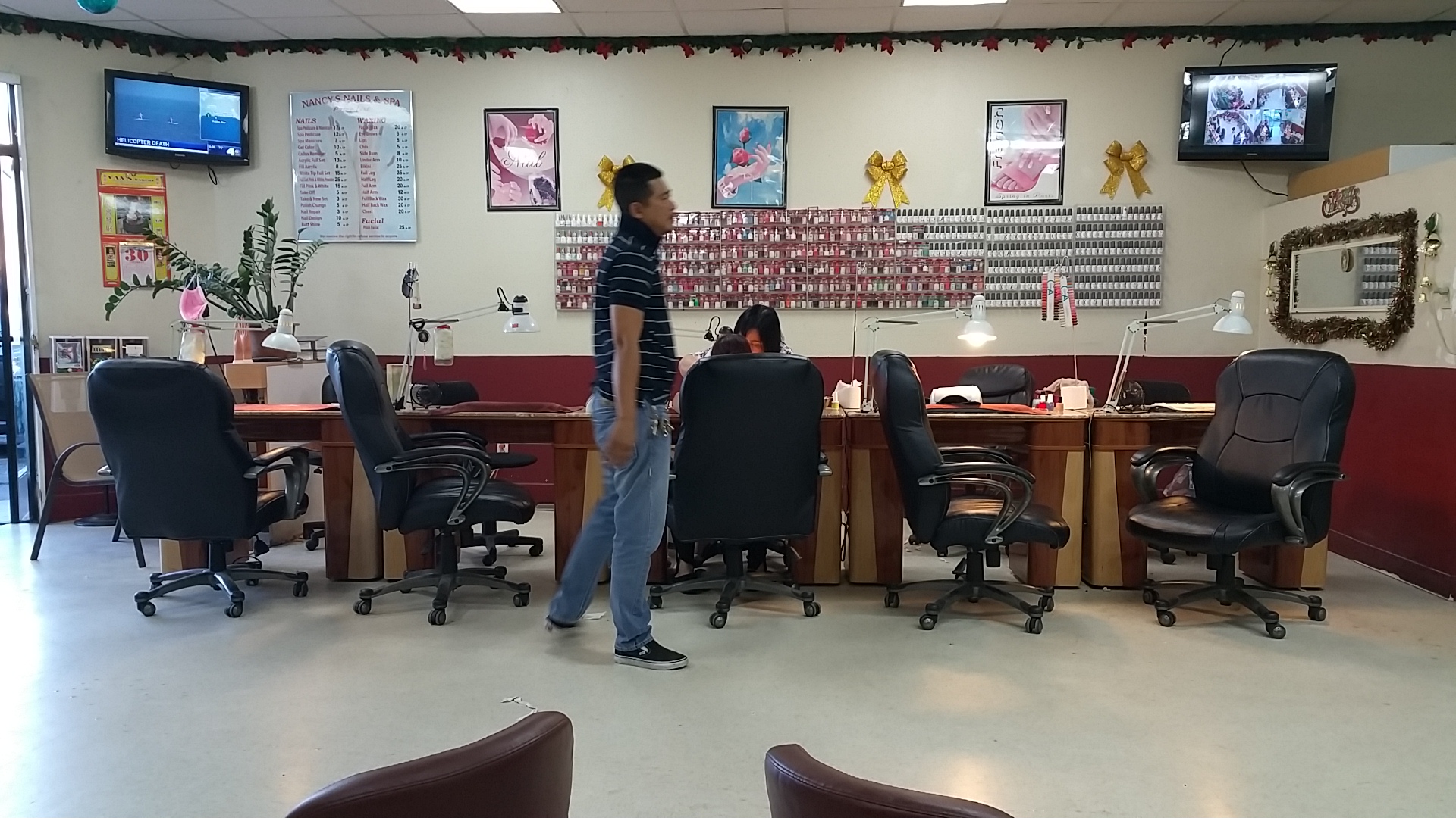 this place is so dirty they have 2 times on the door for open and close and they come neither times and yes the owner Nancy always has an attitude and is rude Got my nails done and they popped off in a day