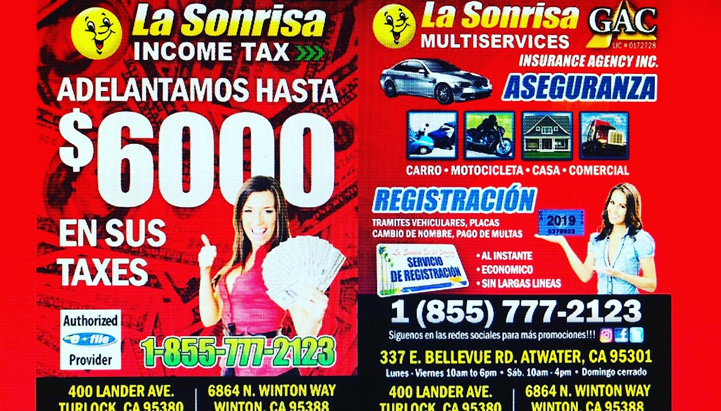 La Sonrisa Multiservices Inc is a Multi-service Company located in Winton, CA and has been servicing all of Winton and the surrounding areas for many years. We specialize in Auto Registrations, Auto Plates, Income Tax, Money Transfer, Packaging, Money Exchange, and Traveling Agents. Here at La Sonrisa Multiservices, our mission is to always provide quality service at an affordable price. The success of our company is due to the dedication we provide to our customers. No matter the job, customer satisfaction is always our number one priority! Don't hesitate to give us a call! (855) 777 2123