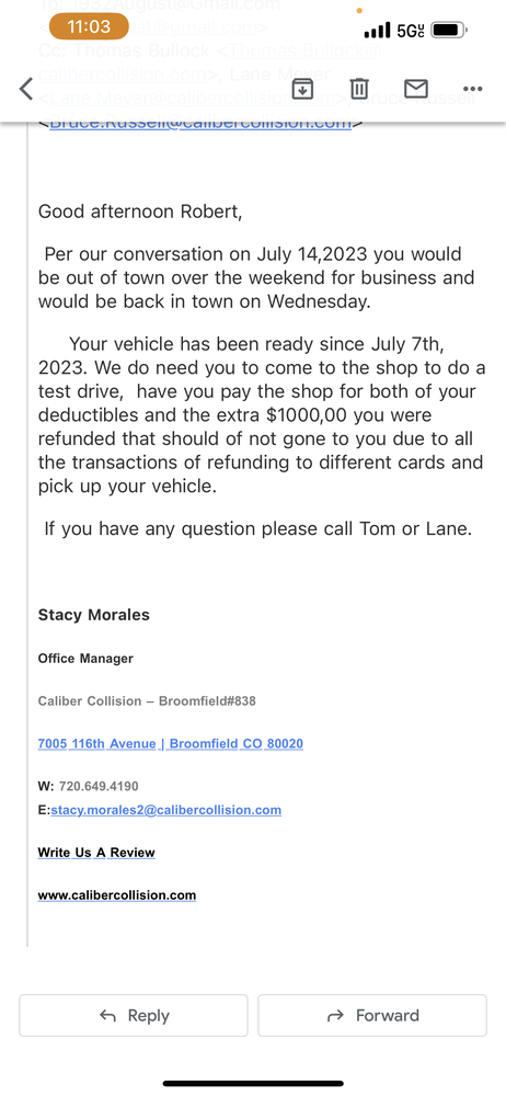 Caliber did an excellent job repairing a broken side window and interior damage to my new Subaru Forester after a break-in. They kept me informed along the way and when I received the vehicle back it was good as new! Highly recommended!