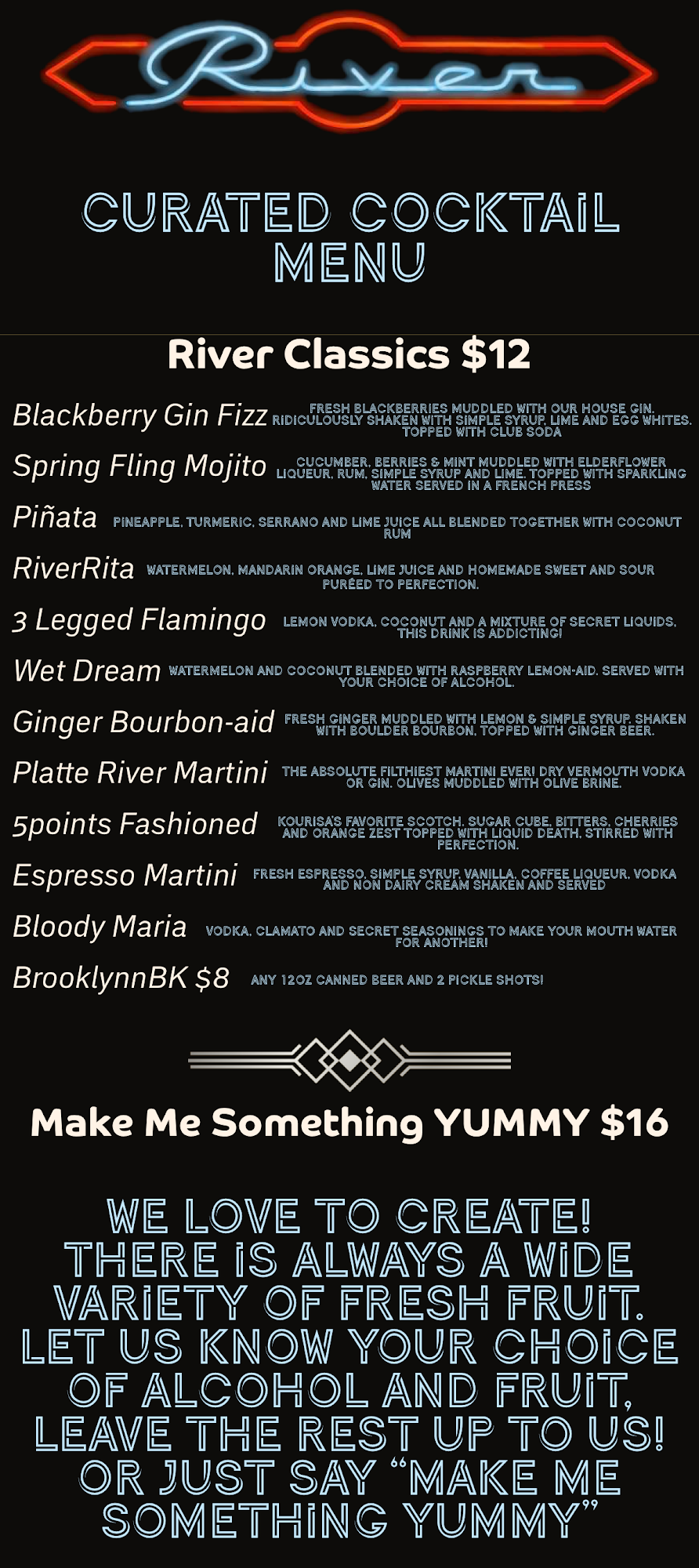 First of all there is no other neighborhood dive bar that is like River! From the owner Kourisa to the bartenders, John, Courtney and Ash… everything is perfect. It doesn’t get more Denver than River Bar