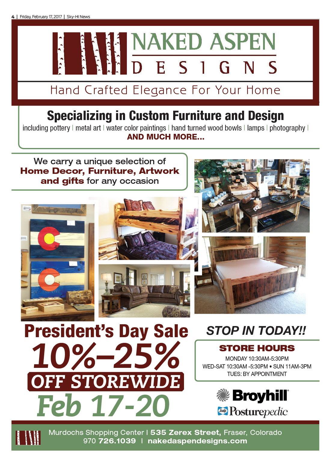 Every time I go into Naked Aspen Designs to buy a gift, ask furniture questions, etc, Im always greeted with a smile. Rob is such a great guy and I love his staff. Plus they helped me get my new Sealy Mattress. Thank goodness I did not have to go to the city to purchase it! Thanks Naked Aspen.