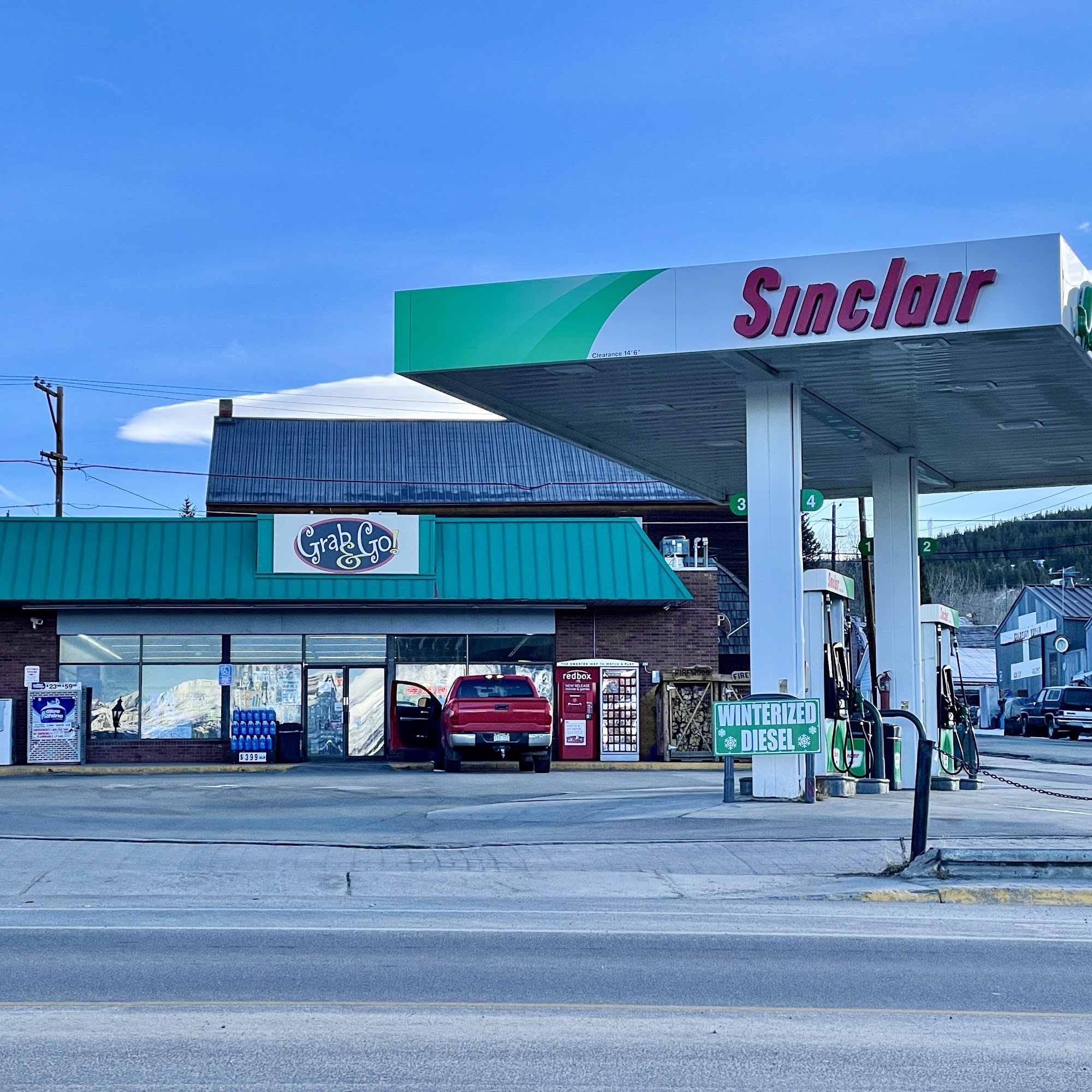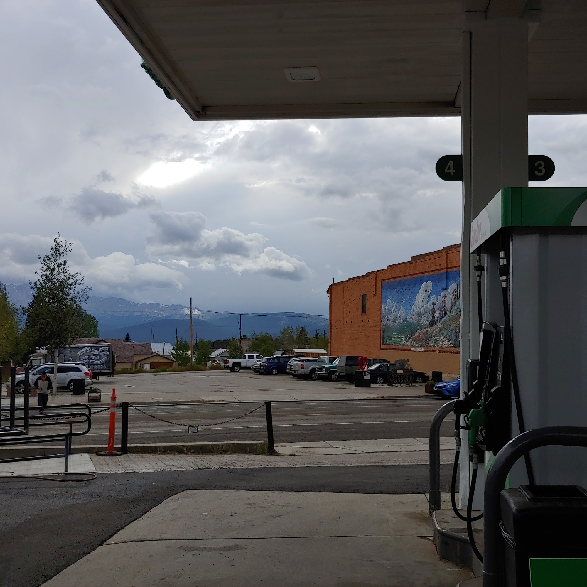 Nice gas station located in Leadville on main Street. Two islands with total of 4 pumps.Outside they have air station, firewood, ice, redbox rental.Inside a large assortment of gifts and souvenirs in addition to drinks, snacks, coffee and all other snack items.