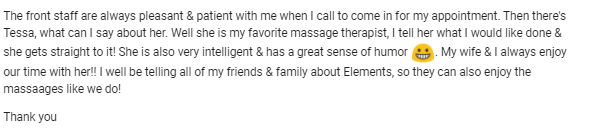 Elements Massage in Littleton specializes in therapeutic, handcrafted, and personalized massages tailored to meet individual client needs. The skilled certified therapists focus on providing a better massage experience. Clients appreciate the spa's inviting atmosphere, although some mention the space is small. The staff is organized and friendly, with reminders sent via text message. The front desk often has two people waiting to assist guests, creating a welcoming environment. New visitors should arrive 15 minutes early to complete paperwork. While some have faced issues with billing or therapist availability, they typically express strong satisfaction with the quality of massages received. Many clients, including those who have experienced relief from pain during sessions, show a desire to return, highlighting the effectiveness of the services provided. Some therapists are better than others, so finding the right match can enhance the experience. Overall, Elements Massage is recognized for its dedicated staff, attentive care, and effective massage treatments.