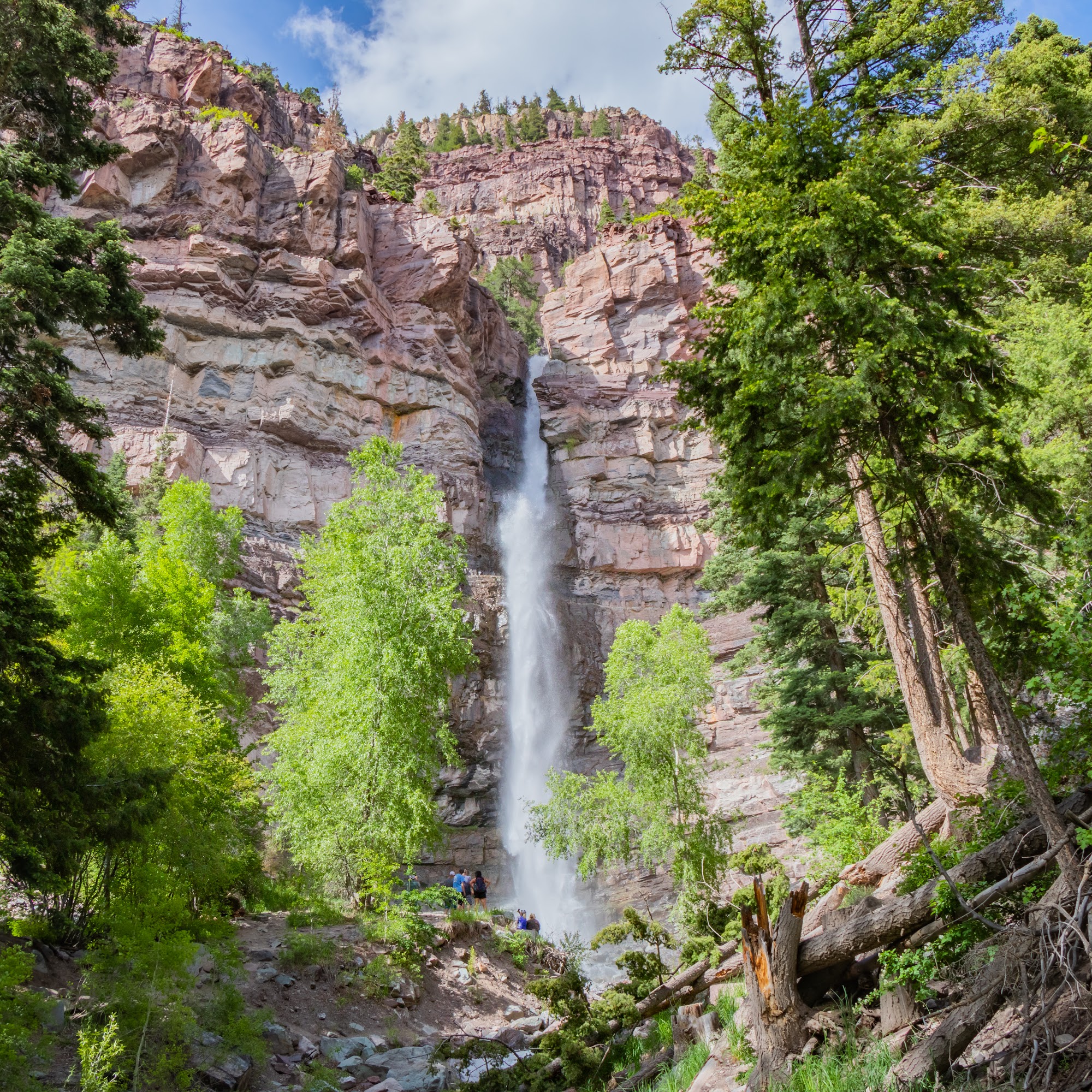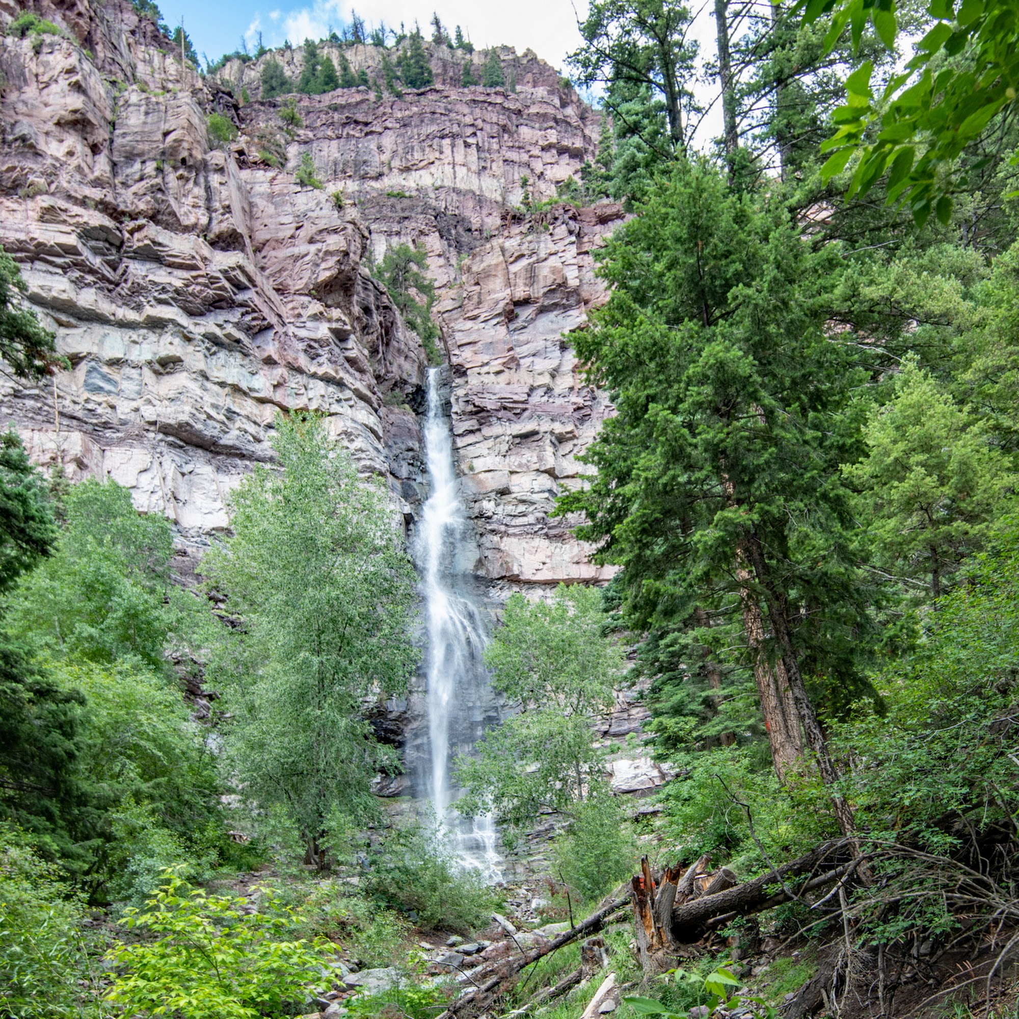 Cascade Falls Park offers a picturesque and easily accessible waterfall experience in Ouray, Colorado. The Lower Cascade Falls trail is a short hike of around a quarter-mile from the parking area, leading to the base of the final waterfall in a series of seven. The falls carry snowmelt off the Ouray Amphitheater and down into the town, providing a stunning natural backdrop. The trailhead starts at a parking area on the east end of Eighth Avenue, with a covered shelter offering views of the falls. Visitors can choose to simply enjoy the falls from the parking lot or continue on the Ouray Perimeter Trail for a longer hike. The trail is suitable for both kids and dogs, offering a lovely nature experience within walking distance of historic downtown Ouray. While the waterfall may not be as spectacular during certain times of the year, the overall experience is still enjoyable. The trail is steep and rocky towards the end, so visitors are advised to hike slowly, rest, and stay hydrated, especially if they are not accustomed to the high elevation. The stunning rock formations behind the falls and the beautiful views of the town make Cascade Falls Park a must-visit destination in Ouray.
