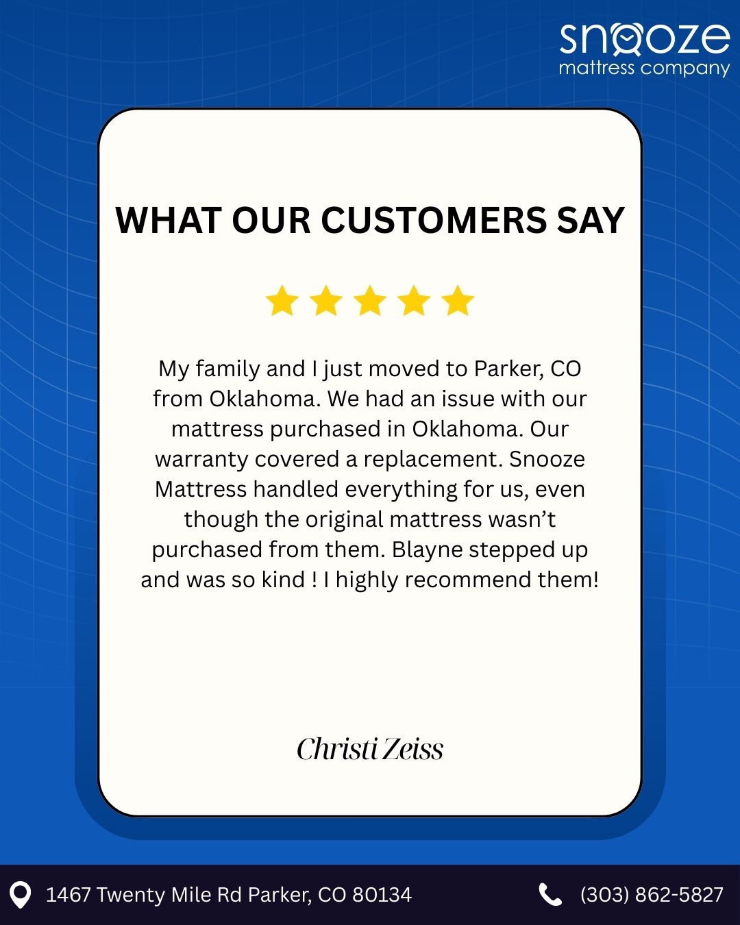 Snooze Mattress Company provides premium mattresses and personalized sleep solutions using their unique Dream Mapping technology, which is recognized by NASA and the Mayo Clinic. Customers can discover their perfect mattress by identifying unique pressure points through dynamic pressure mapping. The business is locally owned and operated, offering a 365-night sleep guarantee. Many reviews highlight the excellent customer service provided by a staff member named Kyle, who is described as knowledgeable, friendly, and helpful without being pushy. Customers appreciate the Dream Mapping system, which aids in selecting the right mattress tailored to individual comfort needs. The store's atmosphere is welcoming, and clients feel confident in their mattress choices, often expressing satisfaction with both the quality and price. Overall, Snooze Mattress is highly recommended for anyone seeking a new mattress and a great shopping experience.
