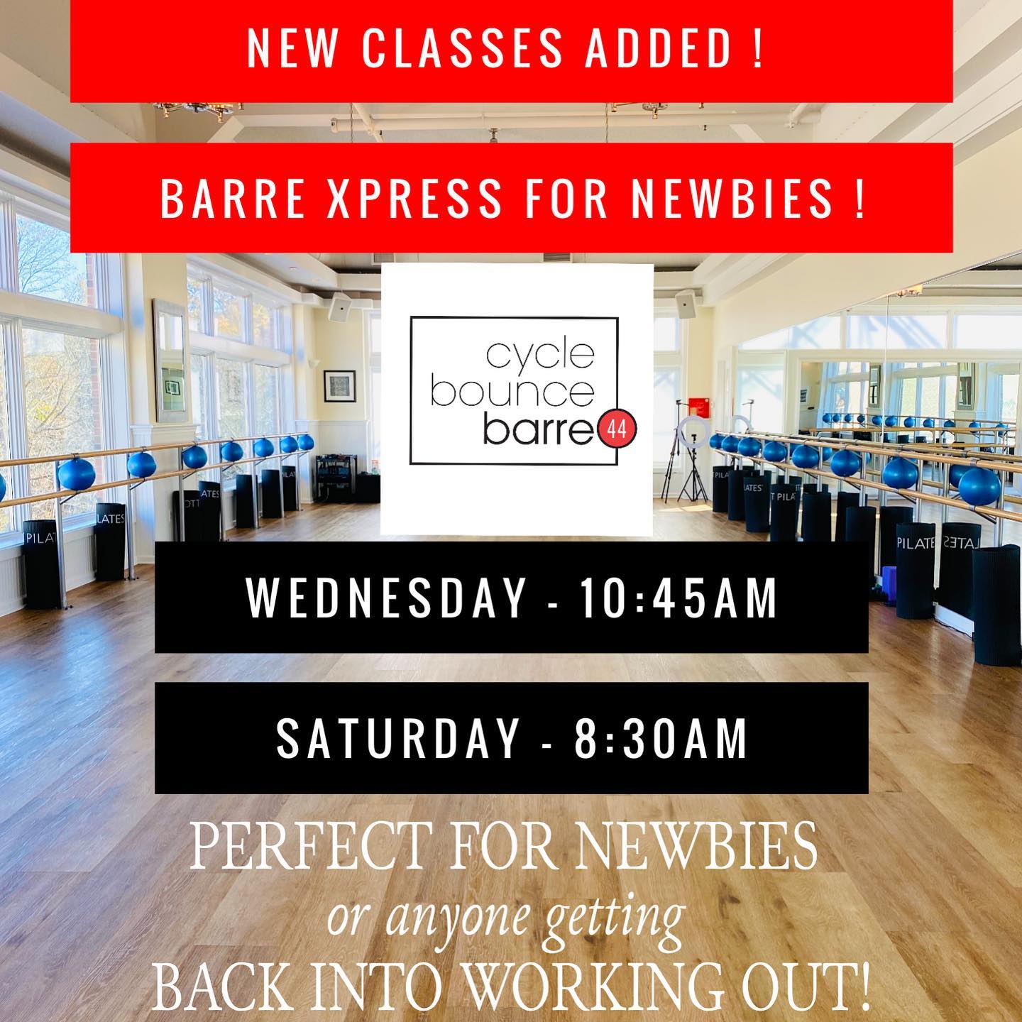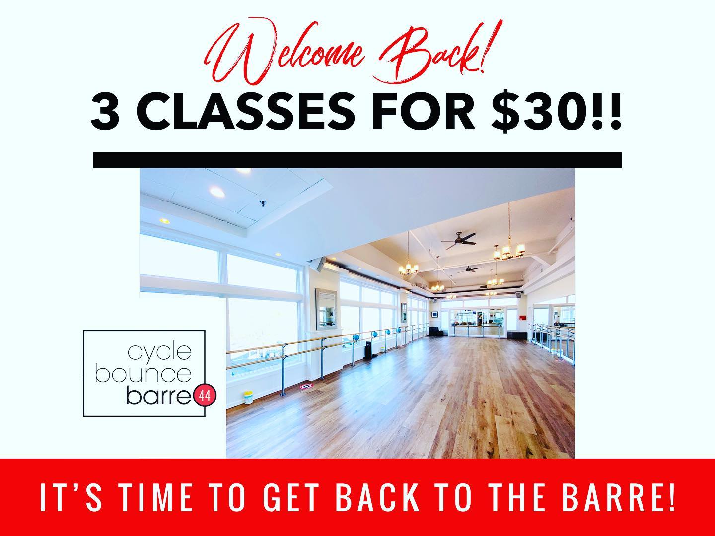 Barre44 is a boutique fitness studio offering Barre, Bounce (rebounding), Strength, Pilates and Combo classes (cycle-barre)! Every class is a full body workout. Barre44 classes are unique from the traditional barre classes that only include small isometric movements. Our programming is Pilates based so we incorporate functional, athletic movements to strengthen your whole body! Our membership includes access to all our classes so it's your one stop boutique fitness shop! Try a class today!