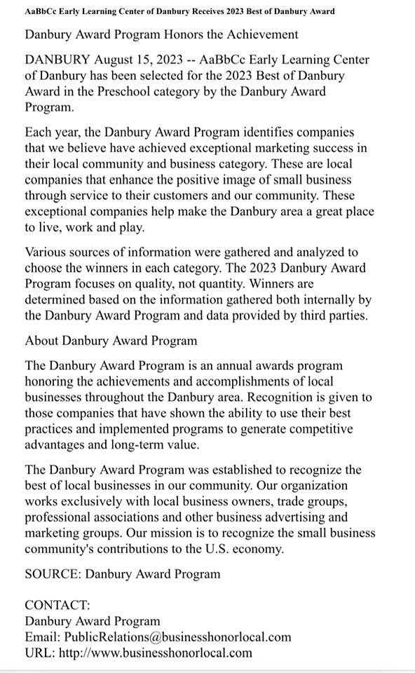 The things your child learns between the ages of three and six years old are critical for development and growth. That's why getting them enrolled in the right preschool is so important! AaBbCc Early Learning Center of Danbury, LLC will make sure they are getting the education they need in a safe, stimulating environment. Our teachers are dedicated to teaching a kindergarten preparedness curriculum that will set them up for future success. Your child will enter kindergarten fully prepared to tackle the challenges of a more rigorous curriculum.