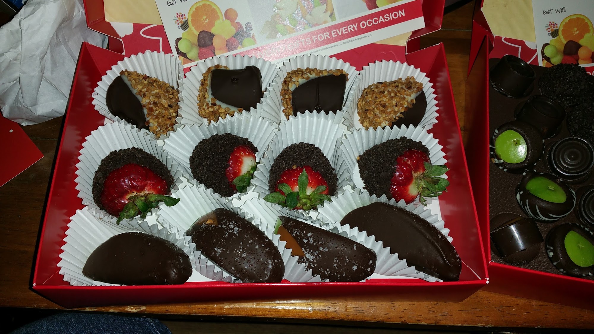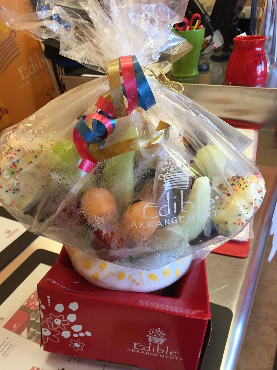 Edible arrangements are always a hit. This time around the melon was a bit under ripe. The rest was delicious. I wish they would indicate how much the larger sizes serve. Very difficult to judge. But overall great presentation and delicious addition to our party.