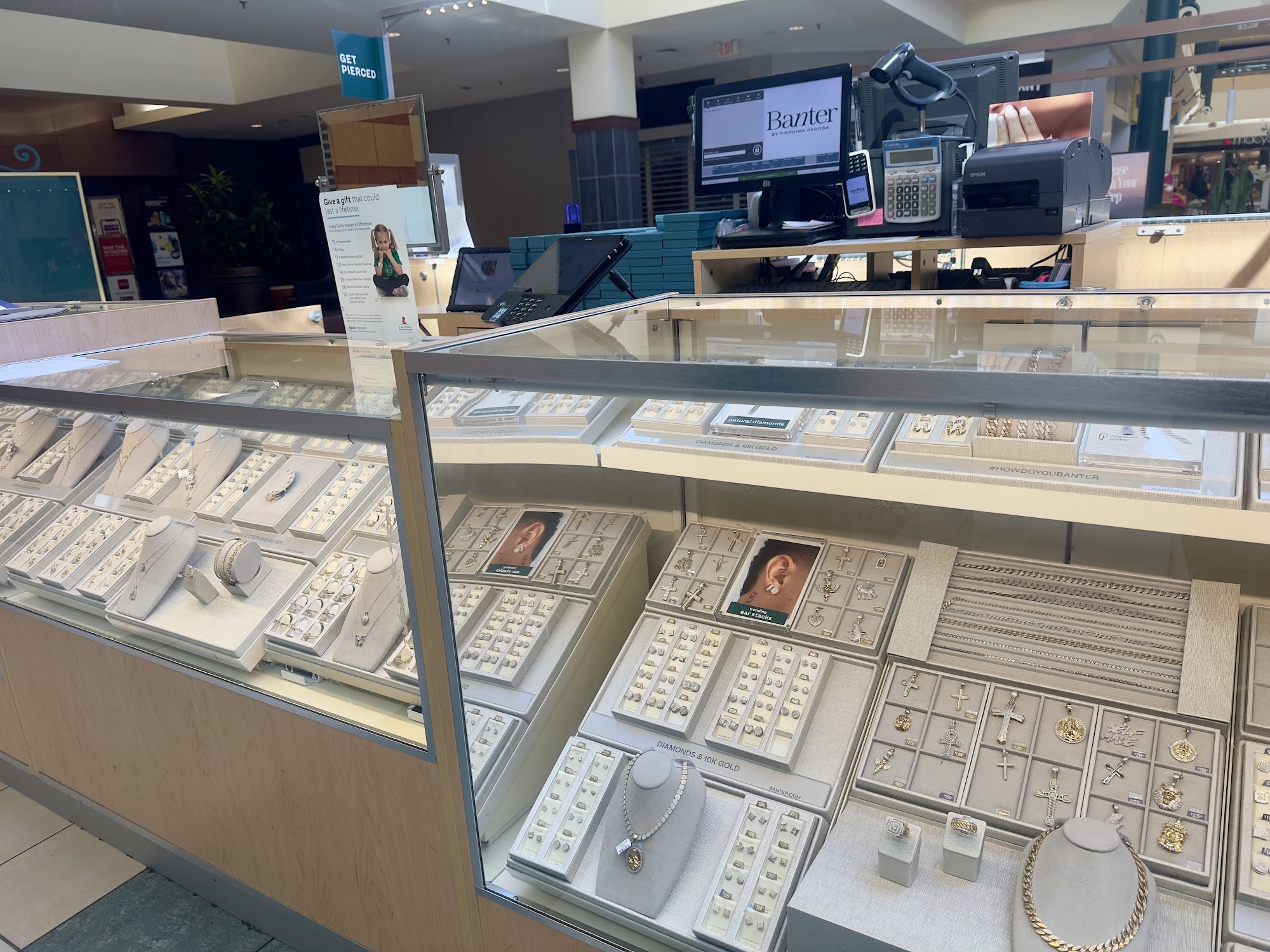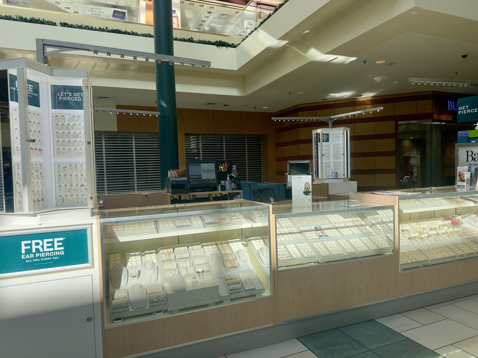 Banter by Piercing Pagoda offers free ear piercings with the purchase of jewelry. The kiosk has over 60 years of expertise, with Piercing Pros who provide incredible, amazing, and knowledgeable service. They help find perfect piercing placement and jewelry, offering great tips and advice. Associates are described as very helpful, intuitive, engaging, and fantastic, ensuring customers are comfortable. Appointments can be booked online, by phone, or as walk-ins. Service is noted as wonderful and absolutely recommendable, with specific praise for warranty work like repiercings. Customers report being very happy and looking forward to returning.