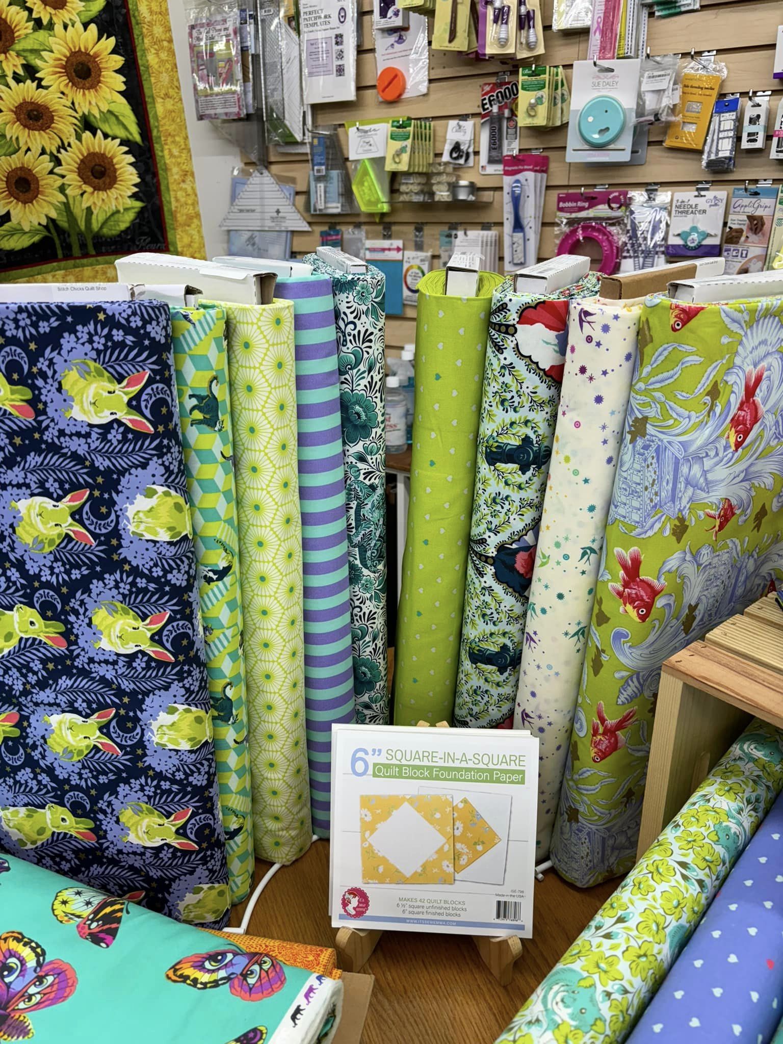Stitch Chicks is a fabulous fabric shop with a varied and beautiful collection of fabric, notions, and supplies. It offers excellent quality at fair prices. More than just a store, it is a tight-knit quilting community and a bustling hive of creativity. The atmosphere is delightful, with amazingly supportive, friendly, and helpful people, making everyone feel welcome. It provides many classes from beginner to advanced, open sew times, and engaging quilting livestreams. While it does not sell ready-made quilts, it is a wonderful place for endless inspiration and to meet other quilters.