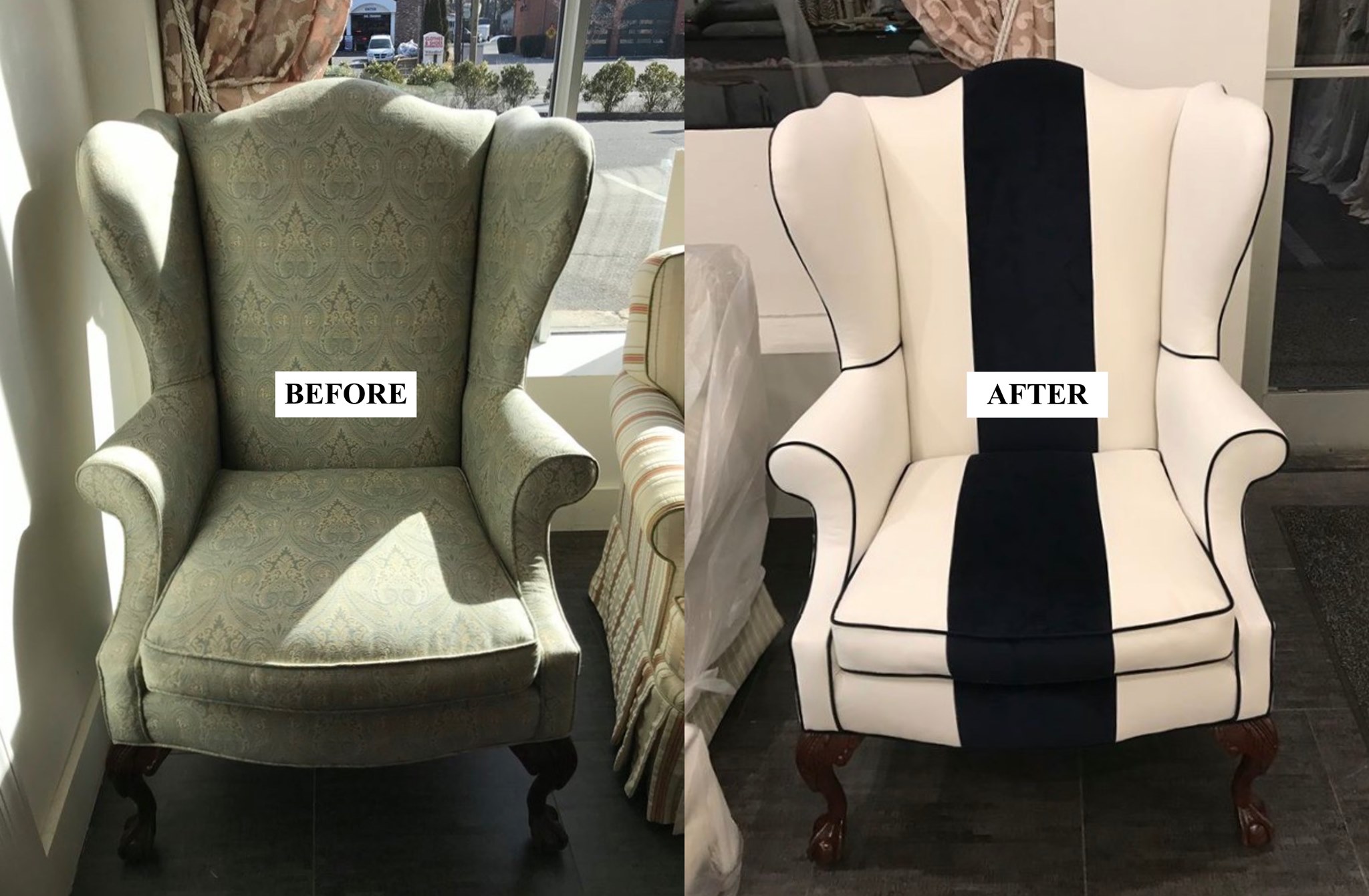Linda transformed my old club chairs to look elegant and modern. It’s hard to imagine a club chair looking stylish, but my two chairs now have a contemporary flair I would have never thought possible. I had two old chairs that were sagging and dowdy and now they look expensive and new.