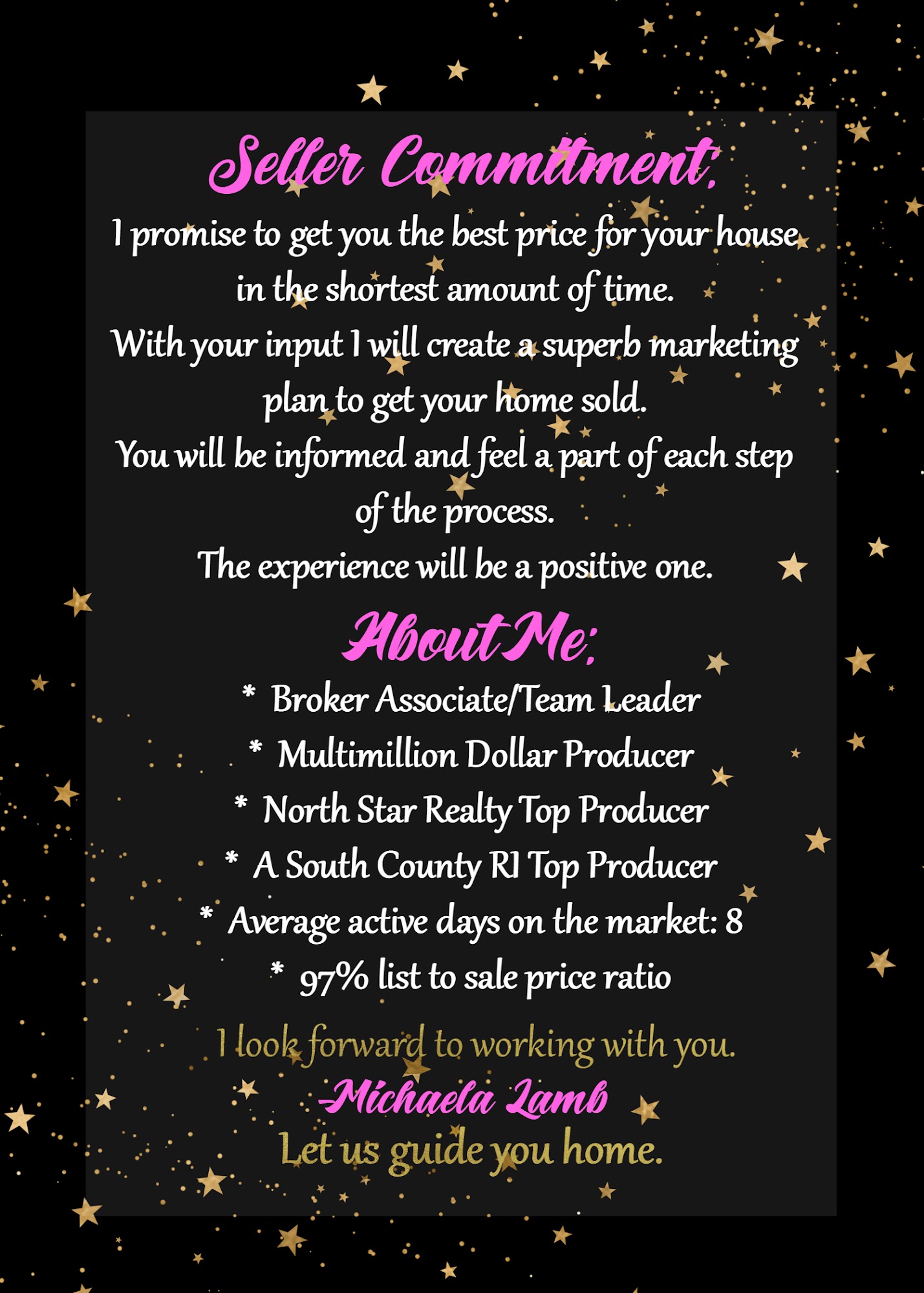 SOLD BY MICHAELA is a full service real estate agency in Westerly, RI. Michaela Lamb, Broker Owner, is a real estate agent serving all of Rhode Island and southeastern Connecticut. A lifelong resident of Westerly, she is a highly sought after REALTORĀ®. Michaela has extensive knowledge and experience as a buyer's agent and as a listing agent. She treats every transaction as if it were an investment she was making for her own family. Buying and Selling can be a difficult time. The agents at Sold By Michaela make the process as stress free as possible. Our team of honest and caring agents are happy to assist you with all your real estate needs.