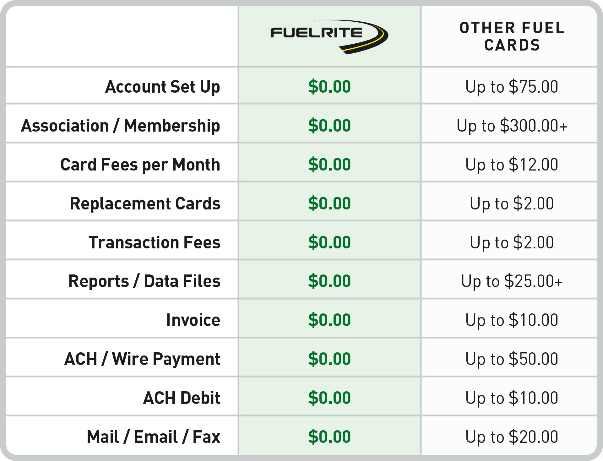 The largest diesel fuel savings network in the Greater Northeast with many more locations in this region than all national truck stop chains combined. Our 200+ locations are some of the region’s best independent truck stops and larger diesel stations in the 11 states of the Northeast. They are located on all major interstate and many secondary roads where the national truck stop chains don’t exist. With Fuelrite’s Wholesale Based Pricing, small and large fleets will save more than the cents off retail price that other fuel cards offer. Unlike these fuel cards, we have no fees: no transaction fees, no minimums, no monthly card fees, no card replacement fees, no management report fees, just no fees.
