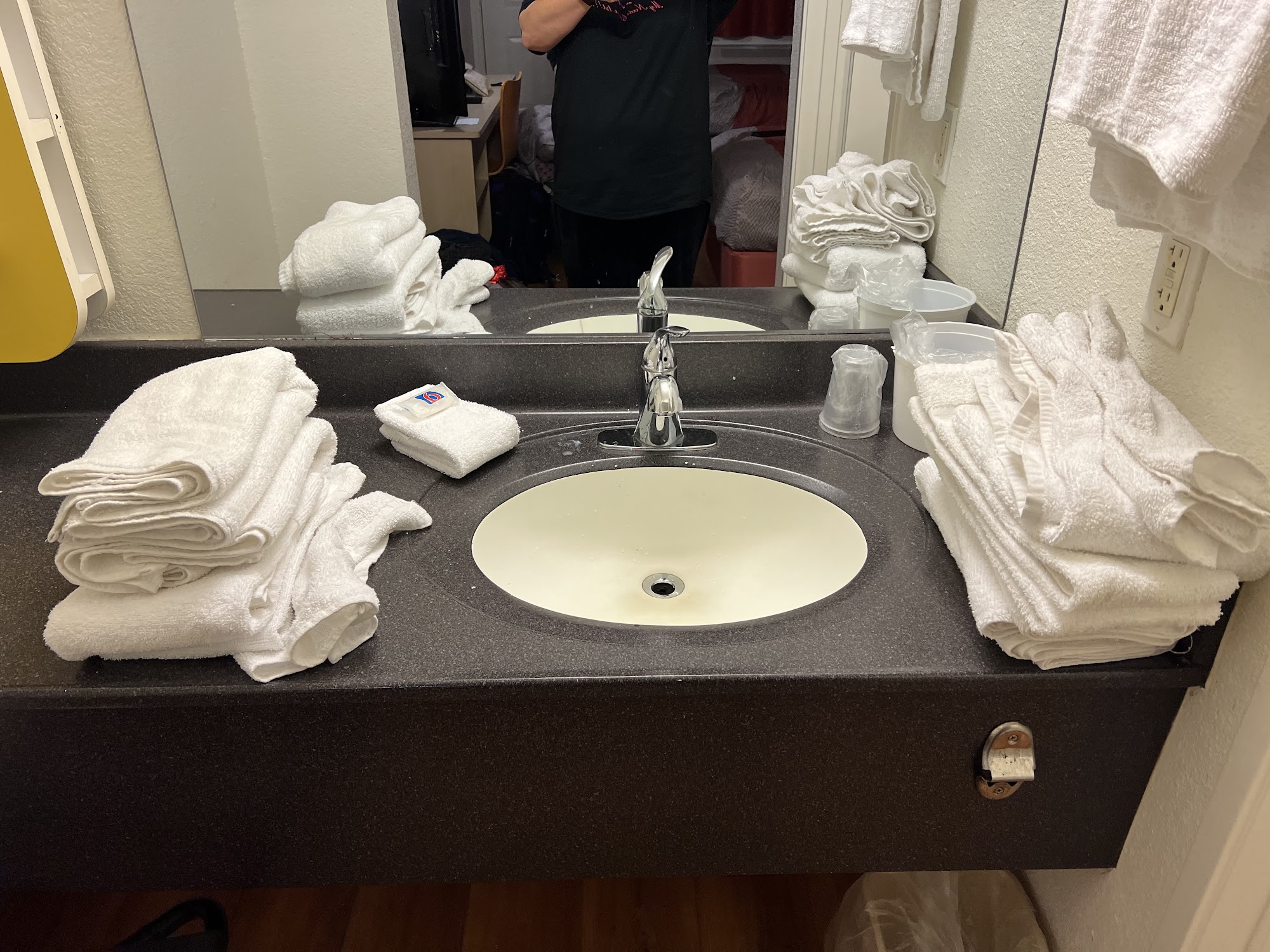 Wife didn't feel safe. Man called her room asking if she would like some cigarettes. Room was not the cleanest ( flea ) on the bed. Had to buy disinfected spray at Walmart.