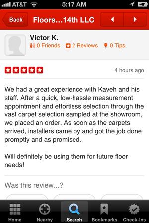 Excellent experience. Kaveh was very responsive and genuinely wanted to working together to make sure I was happy with the floors I selected. I had some delays in my larger remodeling project and Kaveh was extremely flexible with scheduling and services offered. I will of course be returning to Floors on 14th in the future.