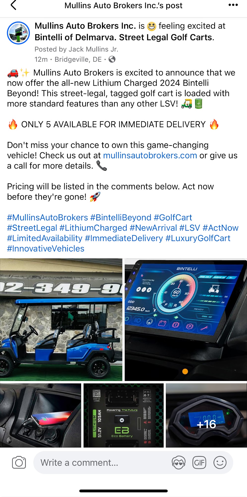 Mullins Auto Brokers is a family-owned business that offers quality used cars at low prices. Customers have praised the team's dedication to finding the right vehicle that meets their needs, with one reviewer highlighting the salesperson Erik's commitment to finding a reliable and spacious gas-saving car. Another customer, Jack, has been commended for his honest and reliable business practices, going above and beyond to ensure customers are satisfied, even with any issues that may arise. The business also services Bintelli Beyond golf carts, with the service exceeding customers' expectations. Overall, Mullins Auto Brokers is known for its family-friendly approach, providing a positive car-buying experience for its customers.