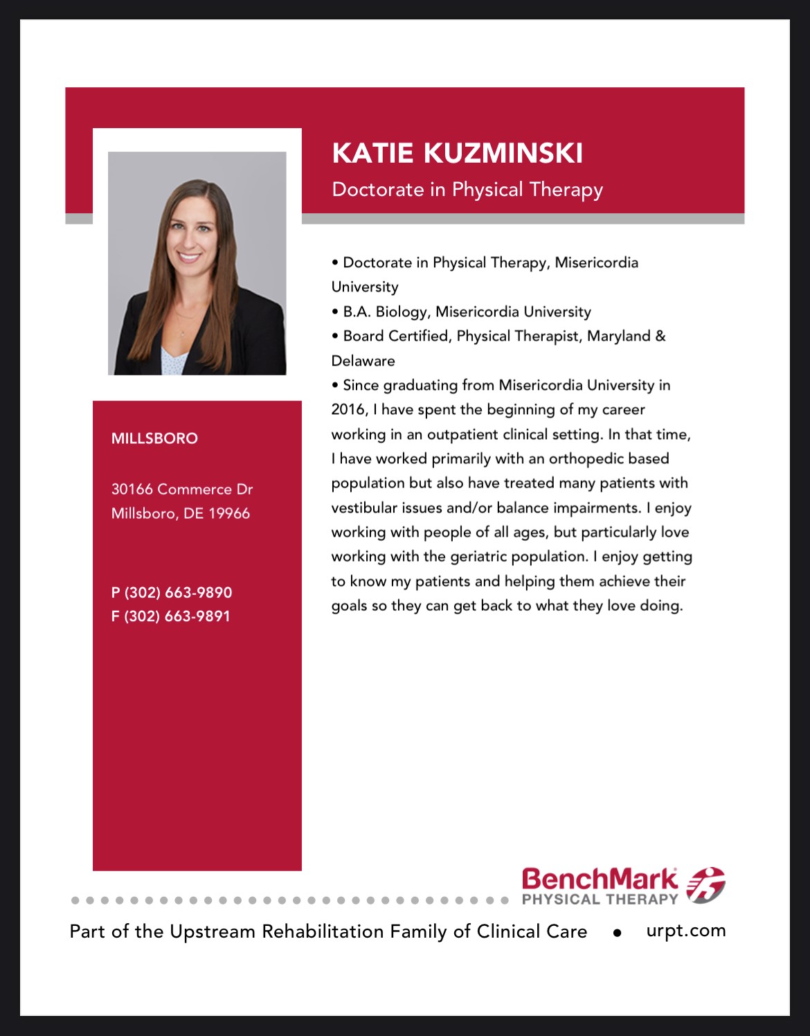 BenchMark Physical Therapy in Georgetown, DE is a leading outpatient clinic. The care is outstanding, patient-focused, and personalized with exceptional dedication. The staff is amazing, friendly, helpful, inventive, and very knowledgeable. The therapists are very competent and give clear details and explanations. The facility is nice with a great, friendly atmosphere. They advocate for patients and provide careful, compassionate support. Patients feel heard and experience significant improvement, recommending it for a genuinely great experience.