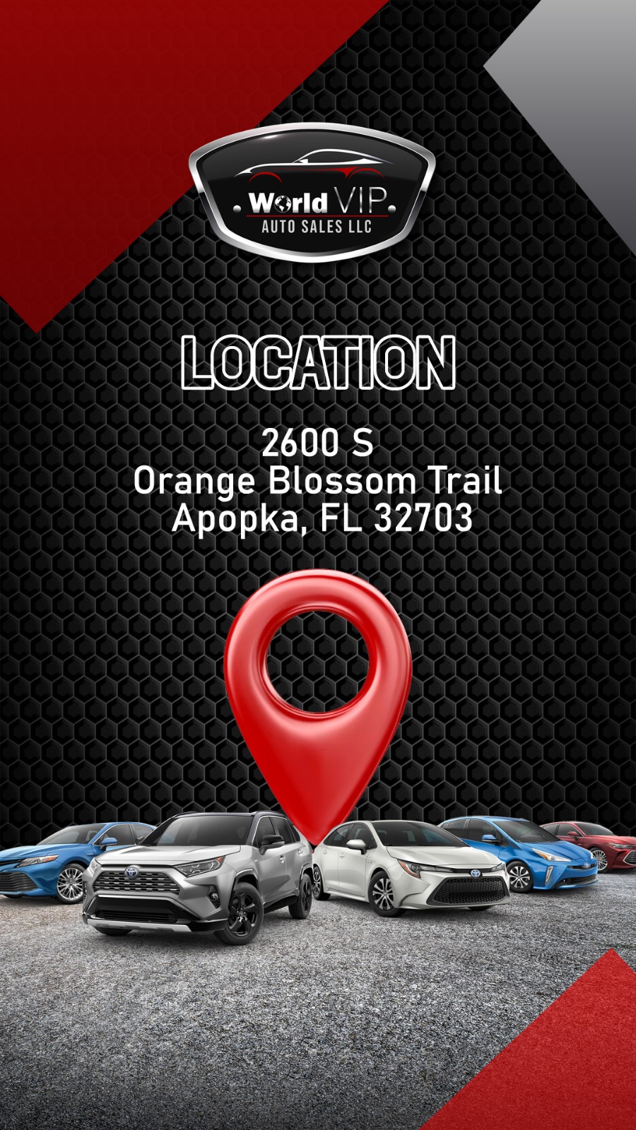 World VIP Auto Sales LLC is dedicated to providing you with the ultimate automobile buying experience in APOPKA FL. World VIP Auto Sales LLC is your #1 source for buying a quality pre-owned vehicle. We have extensive relationships in the dealer community allowing us to purchase a wide variety of lease returns and new car trades at exceptional values. This enables World VIP Auto Sales LLC to pass along huge savings on the highest quality vehicles of your choice. In addition, we offer a full array of financing options to meet your needs.