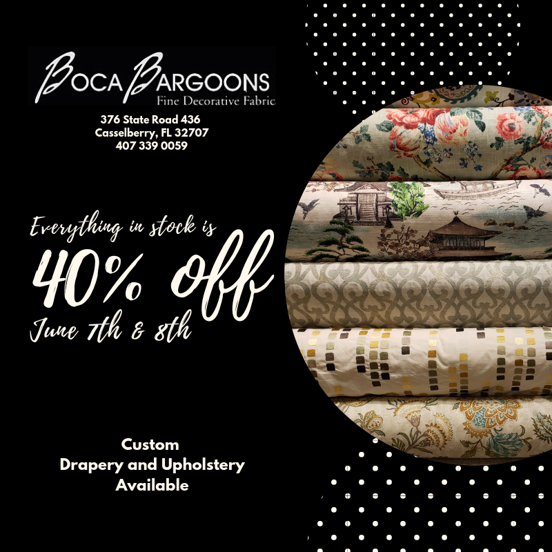 Boca Bargoons Casselberry is a fabric store that offers a wide range of high-quality fabrics, including Scalamandre, Lee Jofa, and more, all at discounted prices. The store is known for its helpful and knowledgeable staff, who are eager to assist customers in finding the perfect fabric for their projects. Customers have found the store to be a treasure trove of beautiful fabrics, with some even admitting to purchasing fabric without a specific project in mind, simply because they couldn't resist the temptation. The store's selection is so impressive that some customers make it a point to visit before making any decisions on upholstery changes. Overall, Boca Bargoons Casselberry is a must-visit destination for anyone in need of high-quality, affordable fabrics.