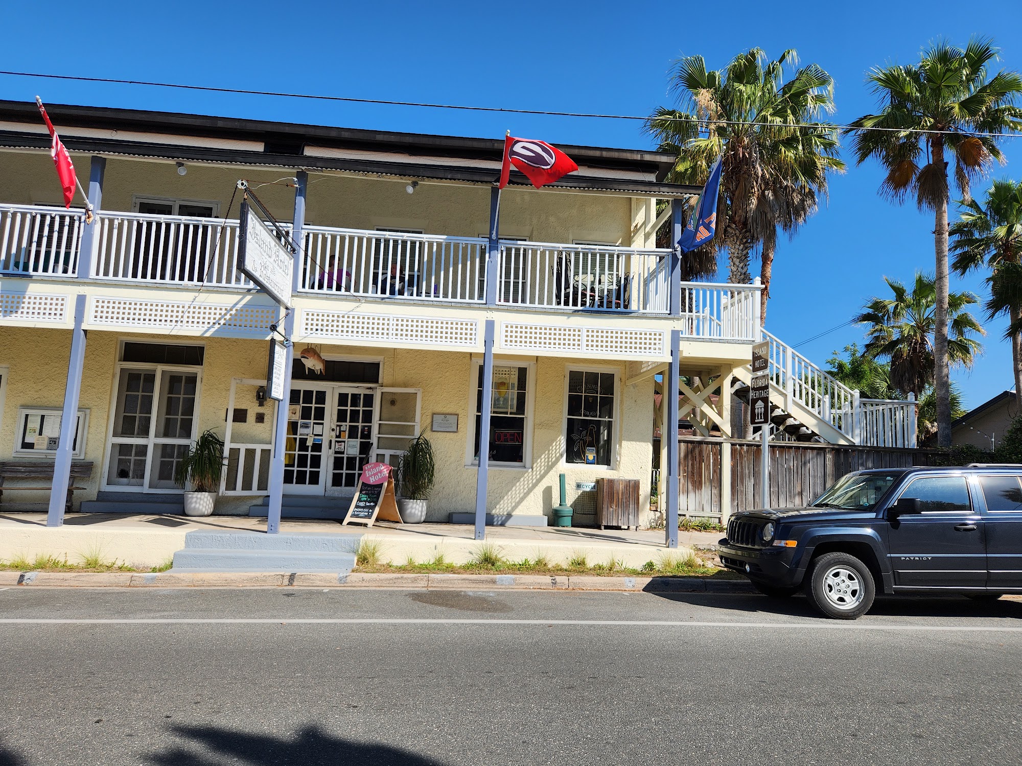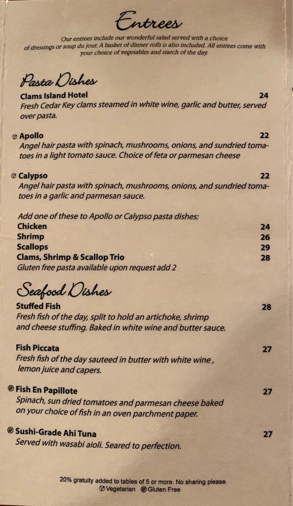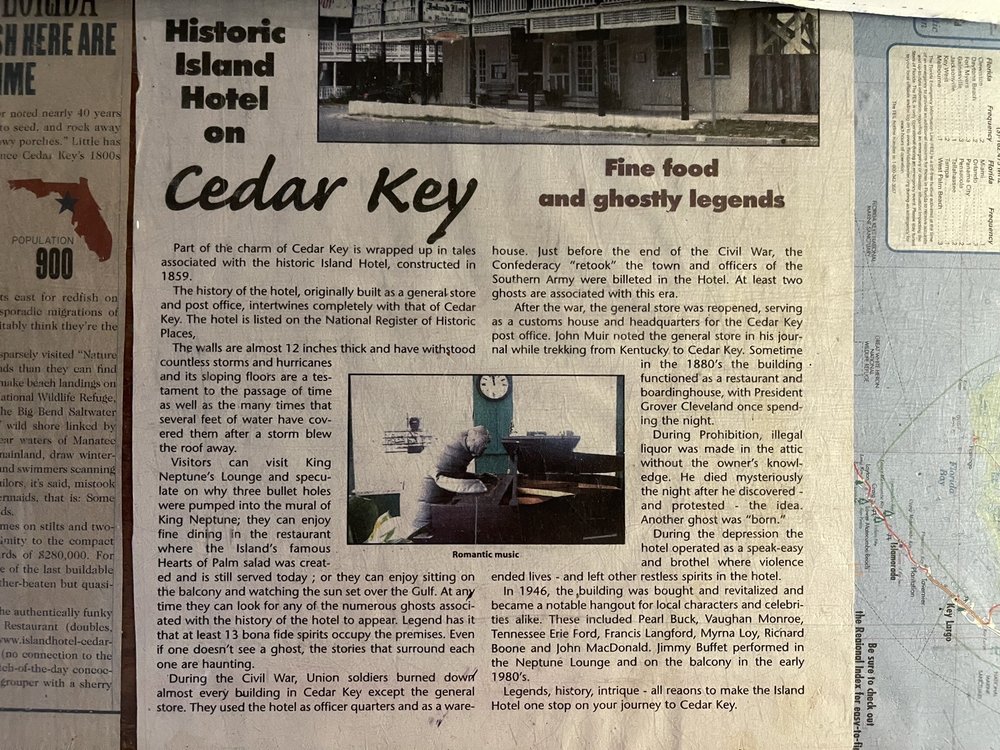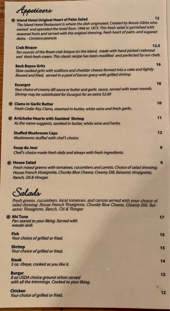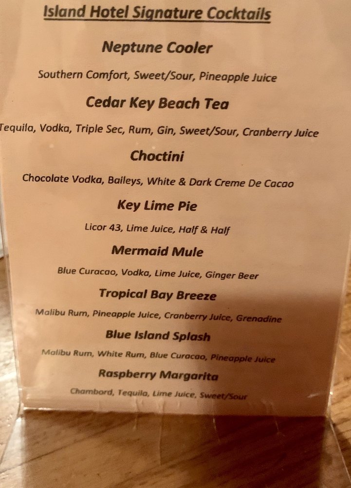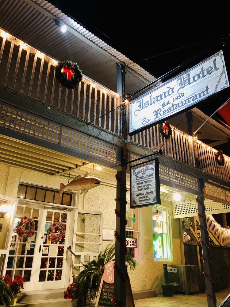 Island Hotel & Restaurant is a historical building offering a perfect experience to slow down time. The ambiance, antique hardware, aged wood, beautiful balcony, and landscaping are an absolute gem. The hospitality and service are first rate, with friendly staff and owners providing established hospitality. The food is fantastic, wonderfully flavored, and consistently good from a varied menu. Favorites include the shrimp and grits, the bacon-wrapped filet, the house salad with hearts of palm, and fresh fish dishes like the fish in paper. Live music is offered most nights. Guests enjoy the balcony for island breezes, an amazing view of Cedar Key, and the amazing sunset. This cool vibe hotel and restaurant is a multi-dimensional experience and a must-try, highly recommended for a taste of a quality experience.