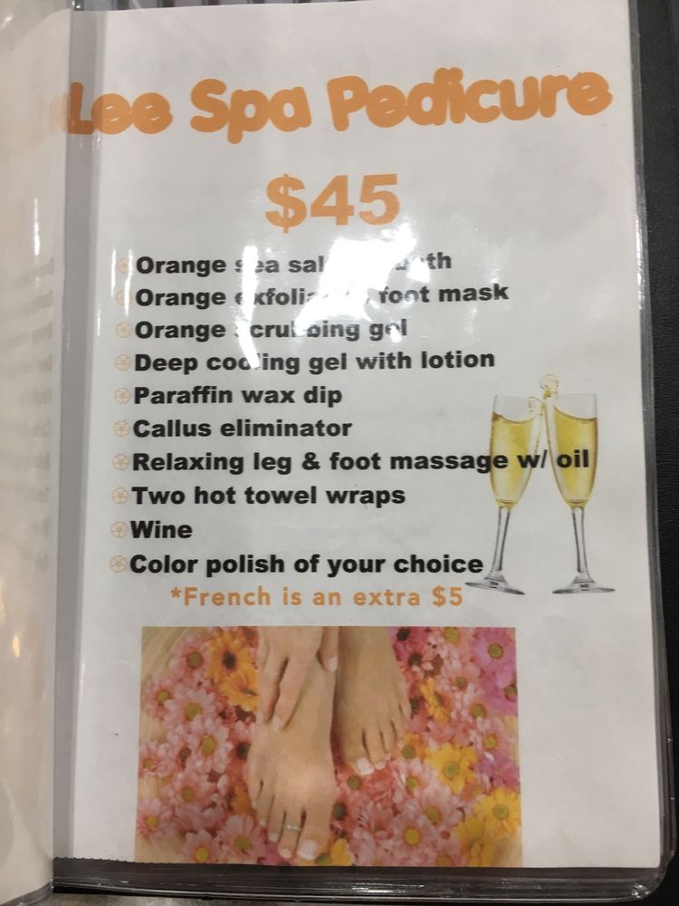 At Lee Spa Nails we are dedicated to providing you with the best experience and services to make your visit as delightful and as enjoyable as possible. Getting your nails done should be an indulgence and Lee Spa Nails understands this. Our goal is to pamper everyone with unique manicures and pedicures that will leave your nails looking elegant and make you feel rejuvenated. As you enter Lee Spa Nails you are greeted by our friendly staff that is highly skilled Nail Technicians, devoted to your care and complete satisfaction, rejuvenating your feet and hands. Lee Spa Nails understands that Safety and Sanitation are very important to customers. Our implements, equipment, and electrical instruments are always thoroughly cleaned and subjecte