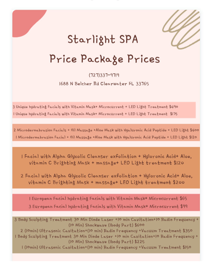 Here to help you obtain the body of your dreams, our body sculpting, facial, and face lifting services are a favorite to many in and around Clearwater, FL. Call or text us today to learn more about any of our services in detail, or schedule an appointment now on our website. Shine bright like a star with Starlight SPA, where beauty meets Relaxation!