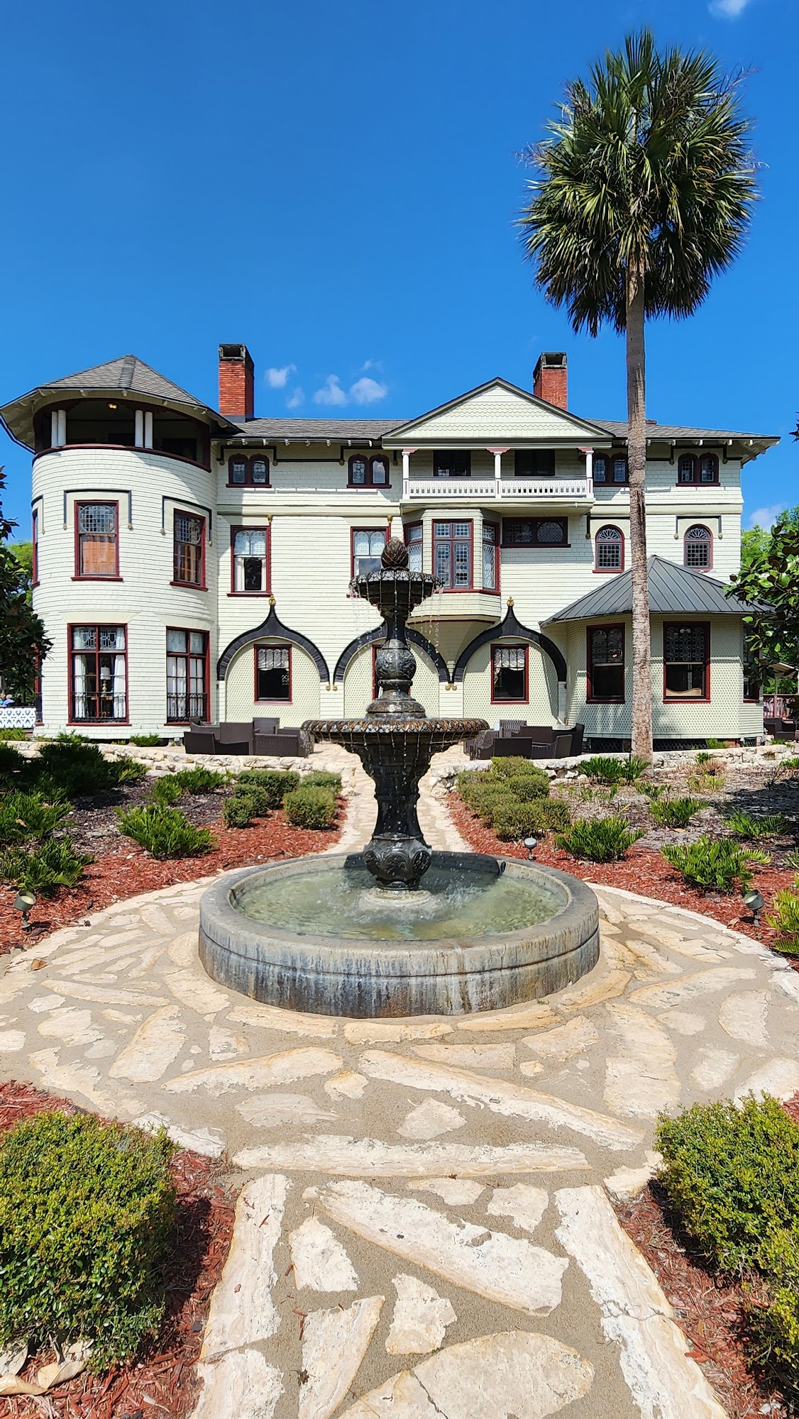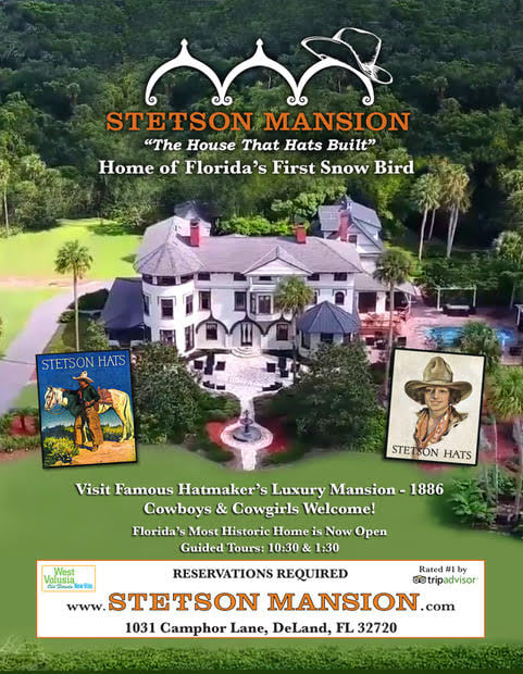 The only private home Rated by Trip Advisor as "Top 10 Attraction In The USA." The famed hatmakers 1886 mansion is Florida's largest, grandest and most historic home built before 1900. It is one of the first homes in the world designed and built with Edison electricity. Florida's first "Gilded Age" estate has been enhanced to current standards as if the original wealthy Stetsons were in residence. It is not frozen in the old Victorian era. Guided tours visit all rooms on all three floors. Visitors walk on 16 different patterns of original stunning parquet floors and look through 10,000 panes of antique window glass. The extravagant "Christmas Spectacular!" decorations are rated #2 in the USA. Reservations Required for all tours and visits.