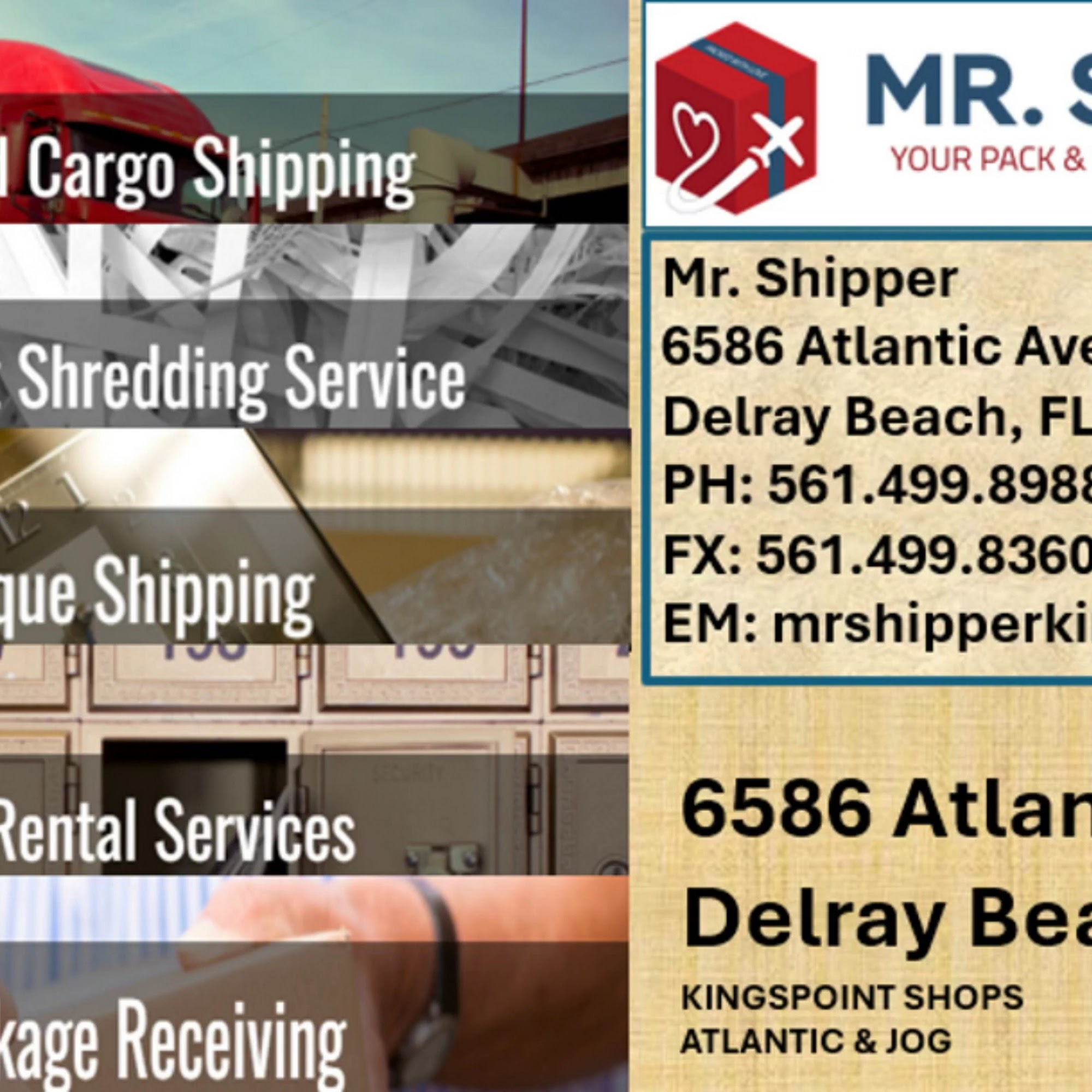 Mr Shipper is a one stop shop in Delray Beach for pack and ship services, packing boxes, mailbox rentals, copy and fax services, passport photos, digital and ink fingerprinting, and notary service. They are an authorized center for FedEx, UPS, DHL, and USPS. They provide packing services for everything from artwork and expensive furniture to the full contents of a home, offering door to door service with care. They also rent Penske trucks for business and personal moves. The establishment is known for its amazing, top-notch customer service. The team is friendly, knowledgeable, reliable, and organized, always ready to assist and go above and beyond. Customers report excellent service that is both competent and inexpensive, saving them time and expense. The reliability is off the charts, and it is clear the business genuinely cares. The new owner and team run a great ship, providing old school real customer service that makes everything easy and trouble-free. It is a five star establishment highly recommended without a doubt.