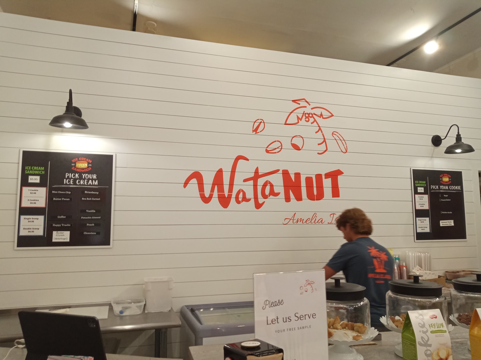 Watanut, a local gift shop, specializes in handcrafted gourmet nut mixes, shortbread cookies, and Amelia Island's best collection of unique local gifts. Watanut is renowned for our delectable ice cream sandwiches, made fresh by hand to order. Choose any 2 of our fresh baked cookies, then pick your favorite ice cream flavor for a one-of-a kind handmade ice cream sandwich. For Amelia Island's best hand dipped ice cream, and ice cream sandwiches visit Watanut on Centre Street, Downtown Fernandina Beach, Amelia Island.