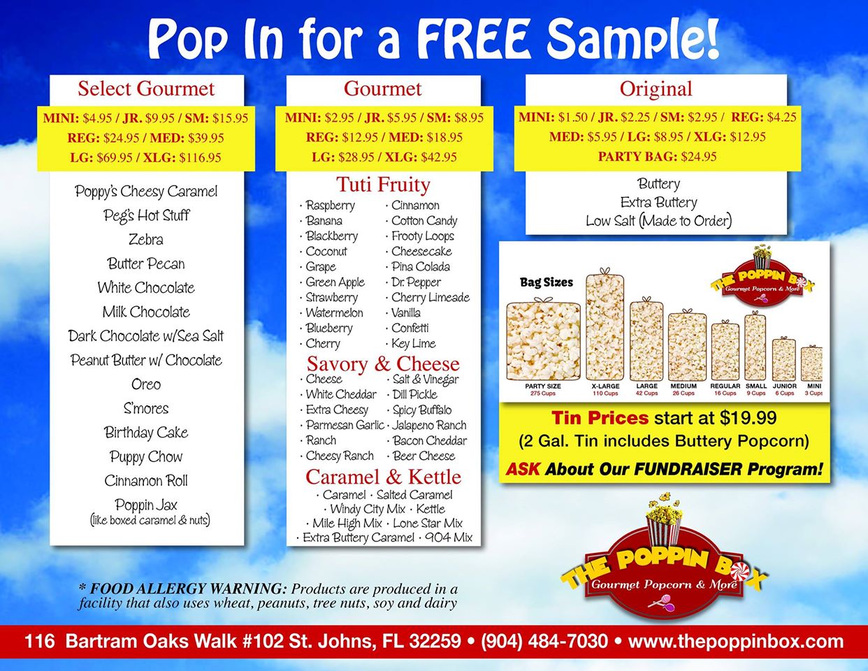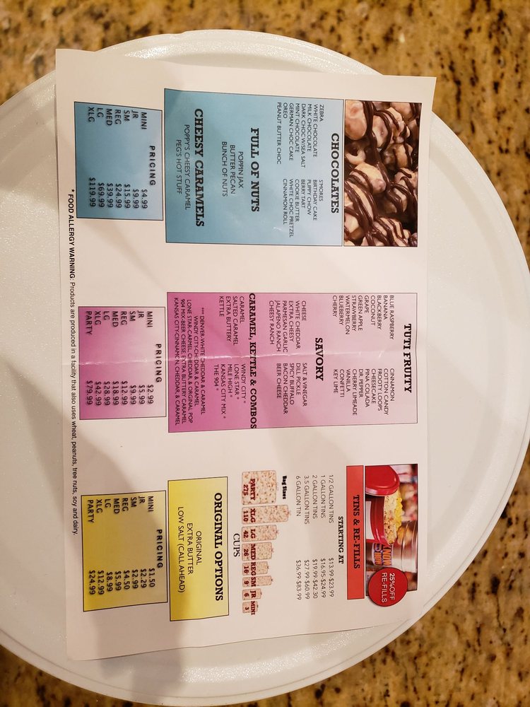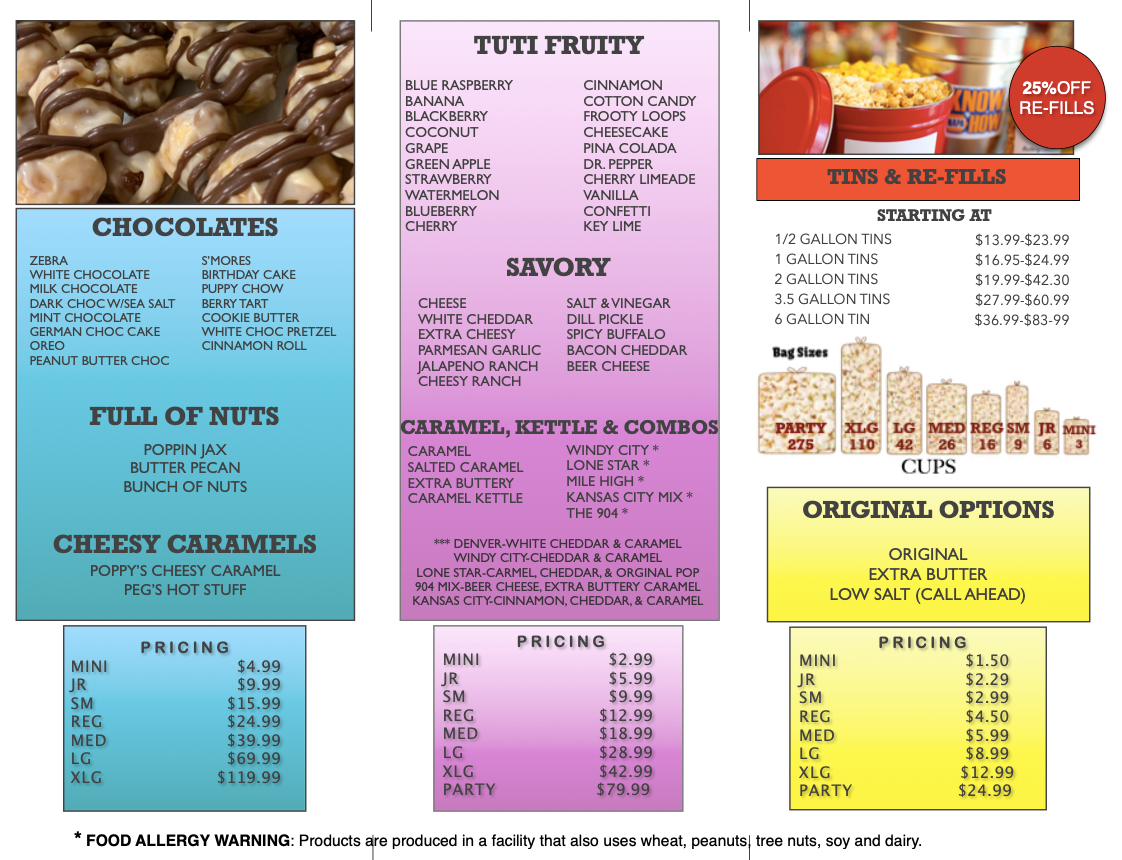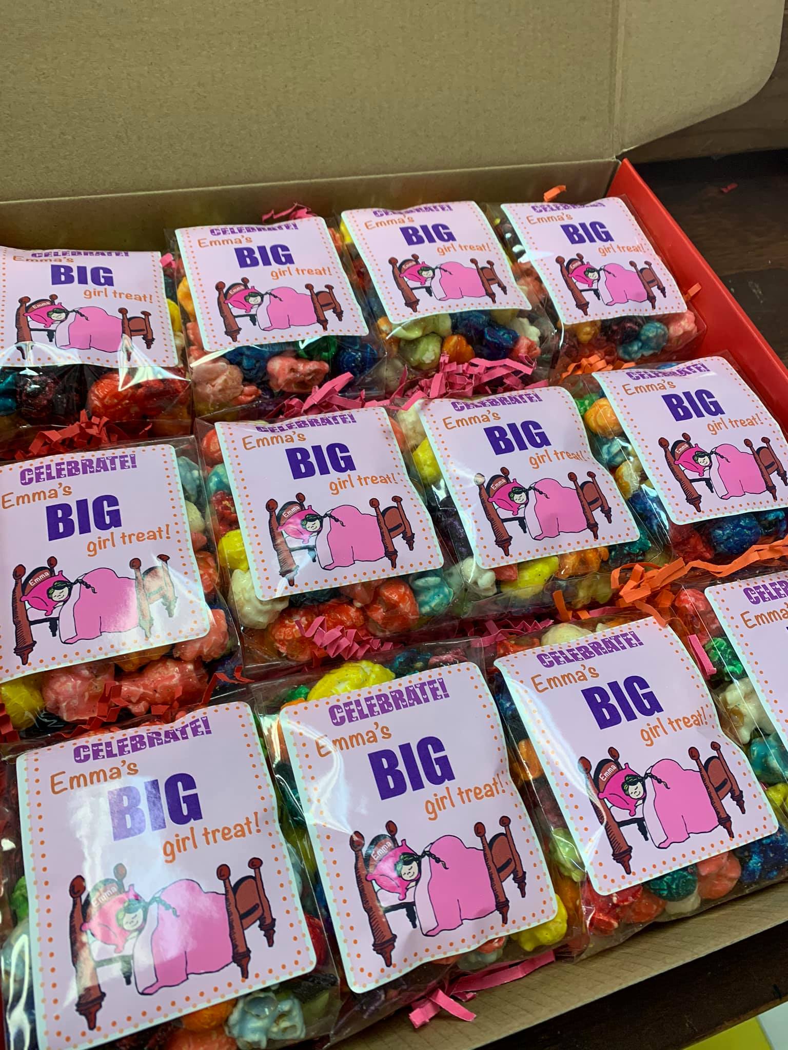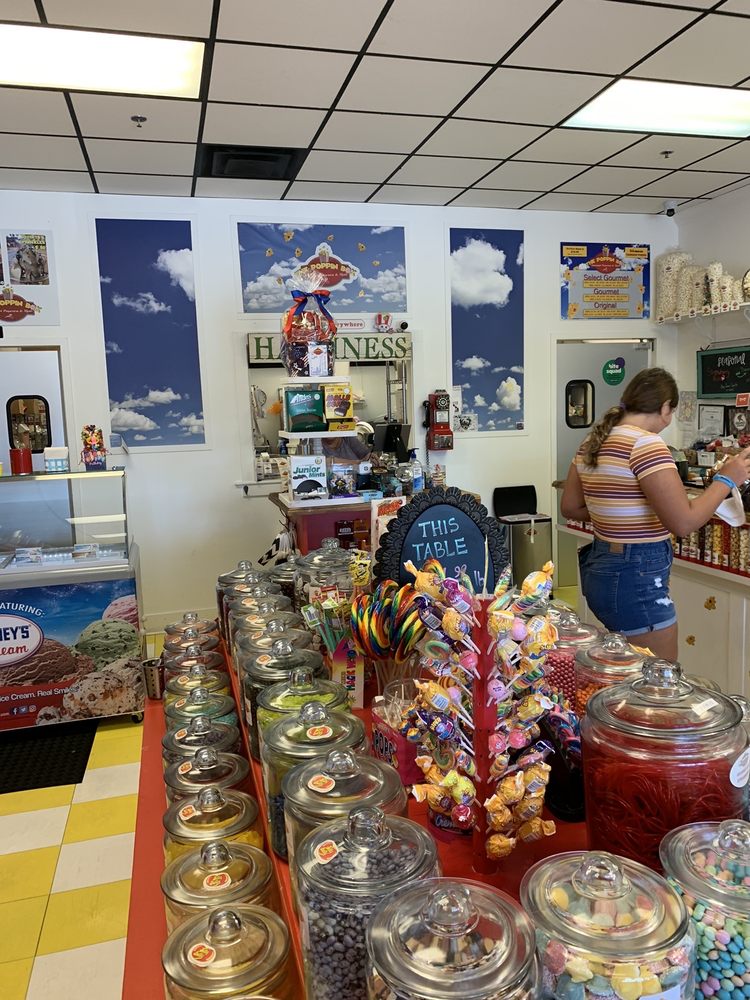 We have over 60 flavors of gourmet popcorn, candy, slushies, fudge, bottled sodas, frosted nuts, candy apples and caramel apples by request. We offer branding for companies and clubs. We offer fundraisers, and we host birthday parties and team building events.