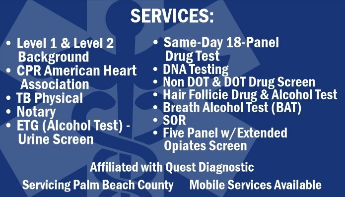 AAA Medical Compliance Testing offers a comprehensive suite of screening and testing services throughout Florida. Their services include DOT and non-DOT drug and alcohol testing, DNA testing, fingerprinting, and CPR certification. They cater to various industries and individuals, ensuring fast and reliable results.