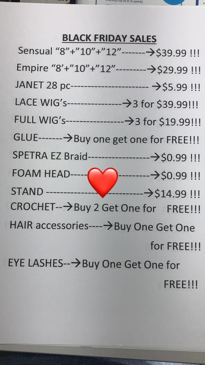 Clean , organized, and fair prices. I also find what I need - they also offer lace front wig installations in store , which I think is convenient if it’s a service you’re in need of