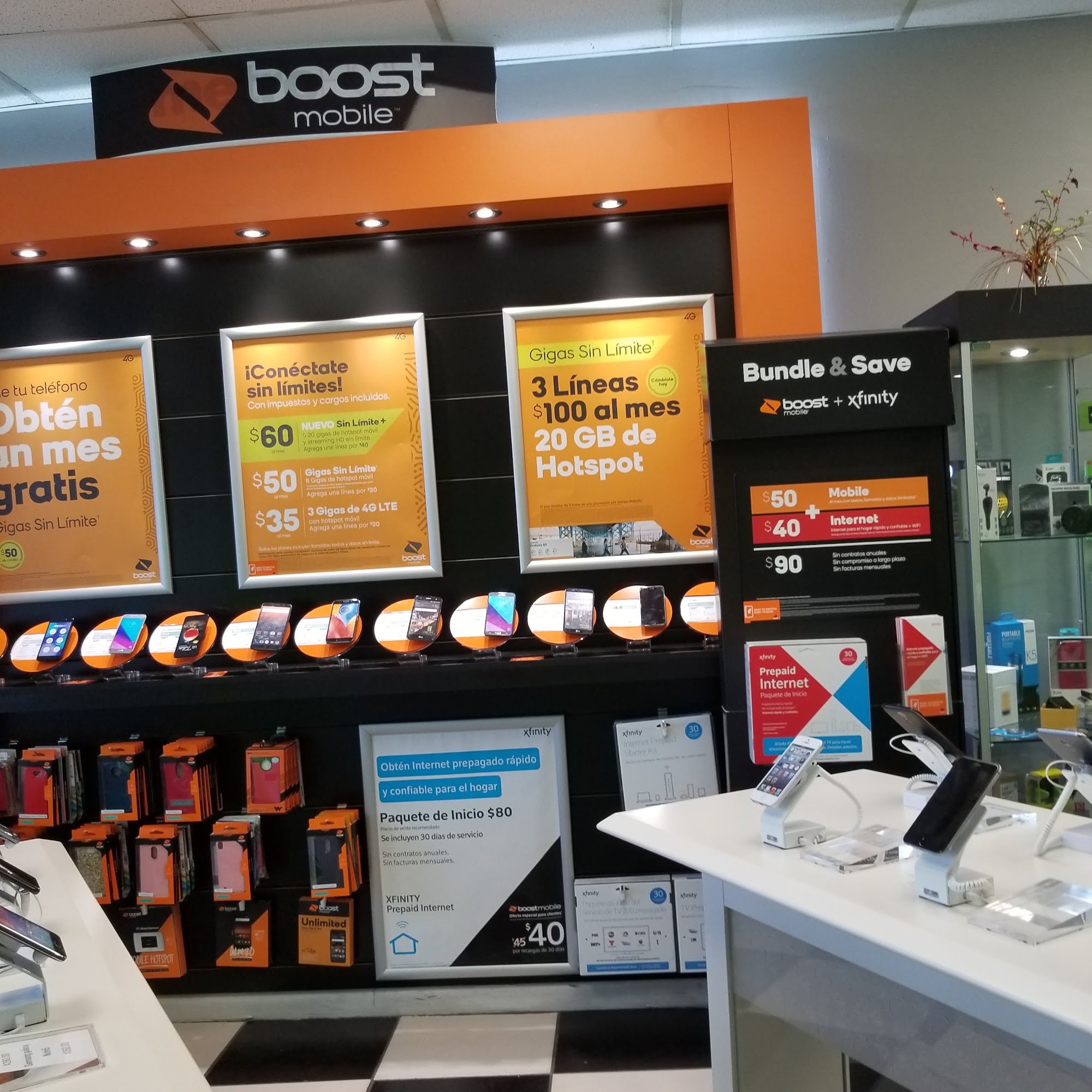 Se habla Espanol! Vendemos cellulares para uso aqui (Boost Mobile, Simple Mobile, y otras companias) , o para enviar a su pais. Hacemos desbloqueos, hacemos recargas a Cuba, y llamadas. Tenemos el servicio de Boss Revolution. Tambien Internet mobil y Xfinity prepago! Varios accessorios para su cellular como estuches, cargadores, audifonos y estuches de audifonos, battery packs