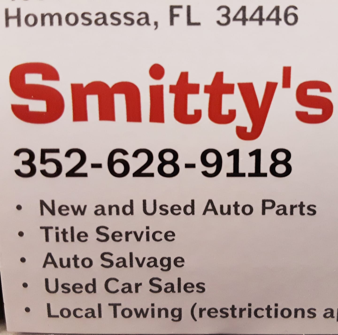 Smitty's Auto Inc. is a family-owned business that has been serving the Homosassa area since 1997. They offer towing services for salvage on a by-appointment basis, Monday through Friday. The business also operates a "you pull" parts salvage yard, with some parts available on the shelf during their parts store hours on Tuesdays, Wednesdays, and Fridays from 8 AM to 4:30 PM. Customers have generally had positive experiences with Smitty's Auto Inc., with one reviewer stating they have never been disappointed with the products they have purchased, and that their Ford F250 is still going strong thanks to the business's honest prices and knowledgeable staff. Another customer found a vehicle they had been wanting for a long time, describing it as a "total barn find" that was "absolutely worth the adventure." However, one customer had a less favorable experience, where they felt the business did not uphold their word on a purchase agreement for a vehicle.