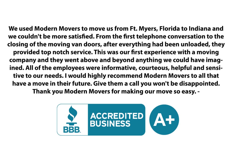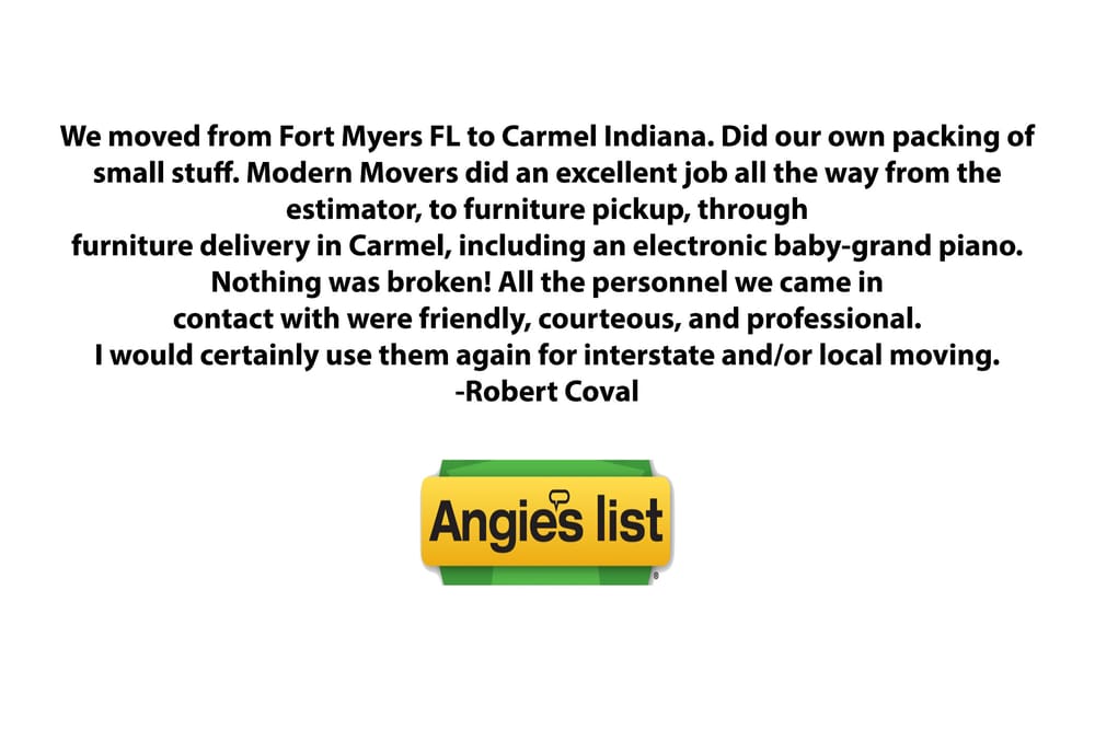 Modern Movers did a great job packing and moving my household from Naples Fl to Greensboro GA. Every aspect was handled professionally, on time and no damage!! I highly recommend Modern Movers!