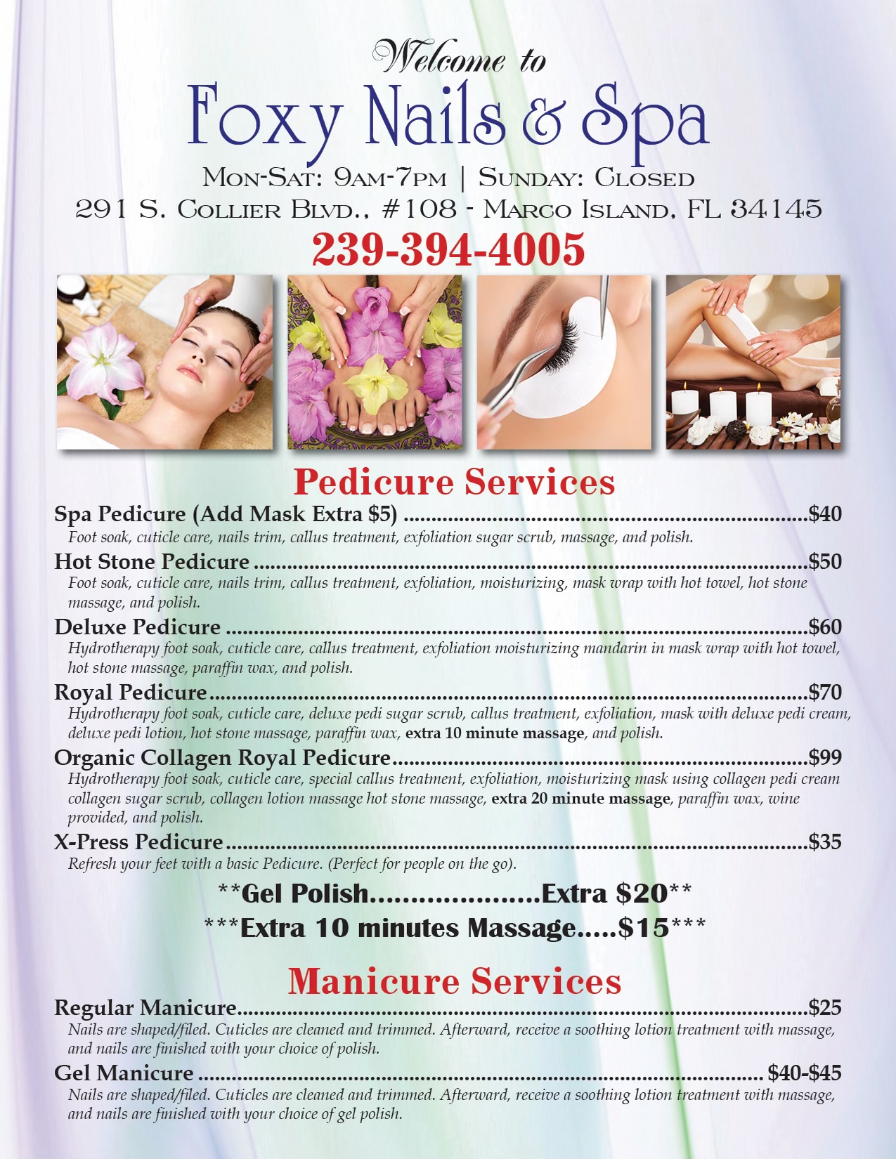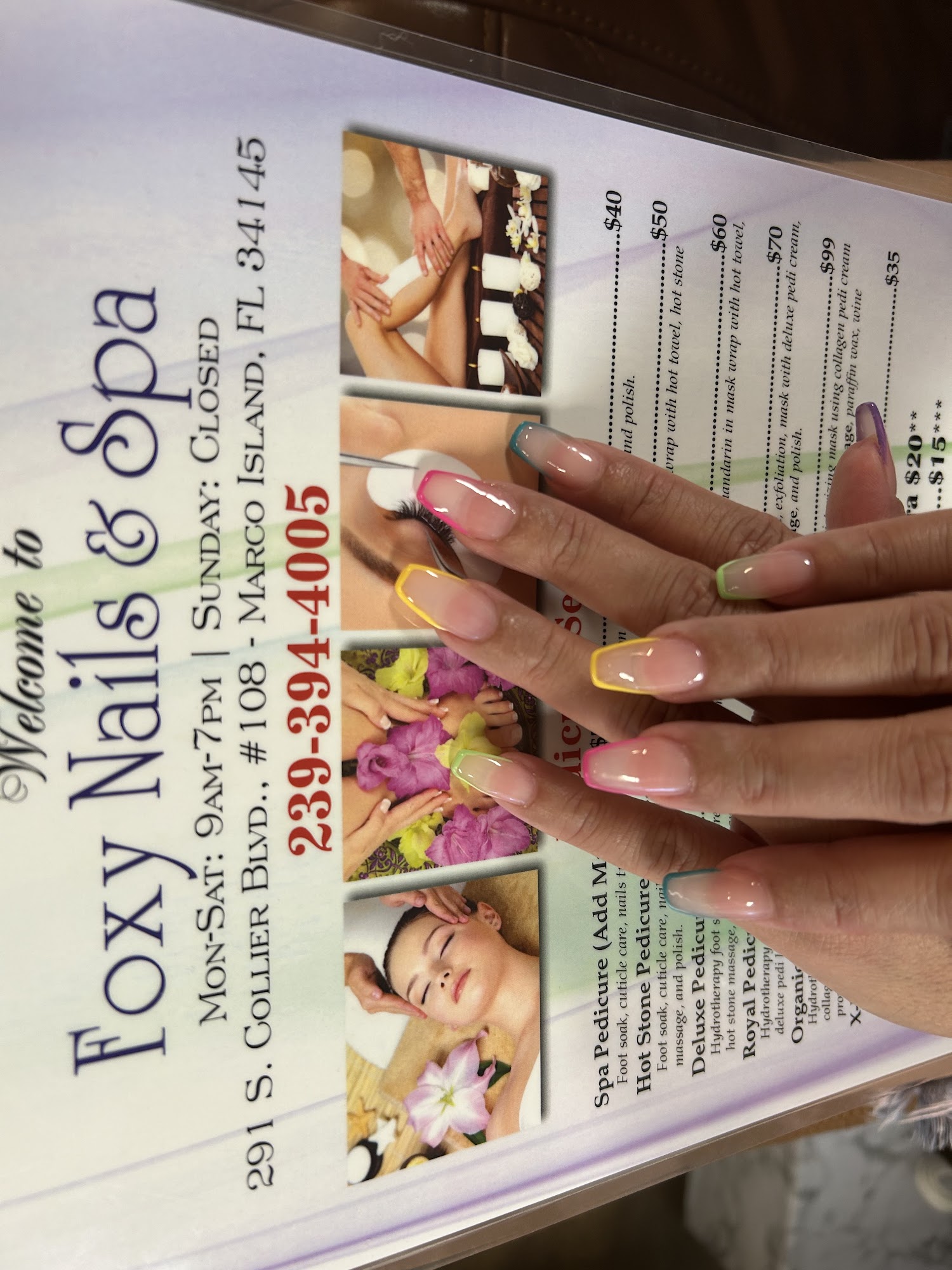Located across from the JW Marriott Marco Island. Two minute walk from the JW spa. Directly across from the public beach access. Professional nail salon. Mani - Pedi-Gel and Dip Eyebrow threadin Waxing- facials-lashes Sanitary - use disposal basin liners - one use packages. Foxy Nail & Spa with over 10years of experience and more than 10,000 clients served, is a trusted beauty destination in Marco island.The salon offers expert nail, pedicure ,facial,eyelashes extensions ,wax services. With a skilled and dedicated team, clients receive not only exceptional service but also genuine care and attention. In a modern and comfortable space, clients can unwind, knowing they’ll leave feeling refreshed, confident, and radiant with their perfect, st