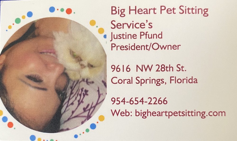 I highly recommend Justine‘s big heart pet sitting service . She’s a very responsible individual and she writes daily reports about my kitties daily escapades. When I returned home from California everything was in perfect order. She also emailed me and sent pictures of my kitties.