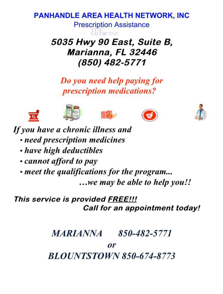 We are here to help individuals with no insurance insurance to obtain their prescribed medications for free and also help with individuals with Medical Part D give us a call 850-482-5771 we are open Monday thru Wednesday 8-3 Thursday 8-1 closed on Friday Give us a call see how we might be able to help you Have a Blessed...