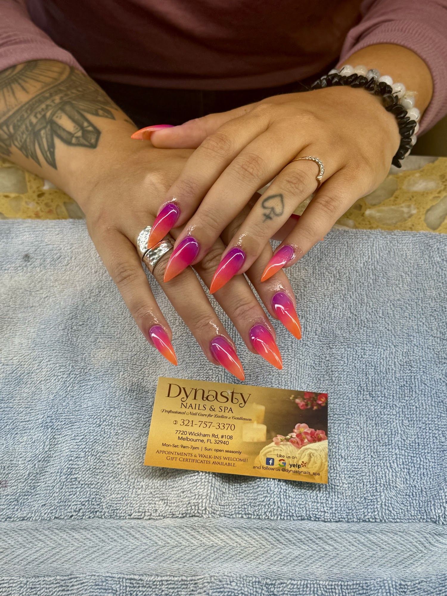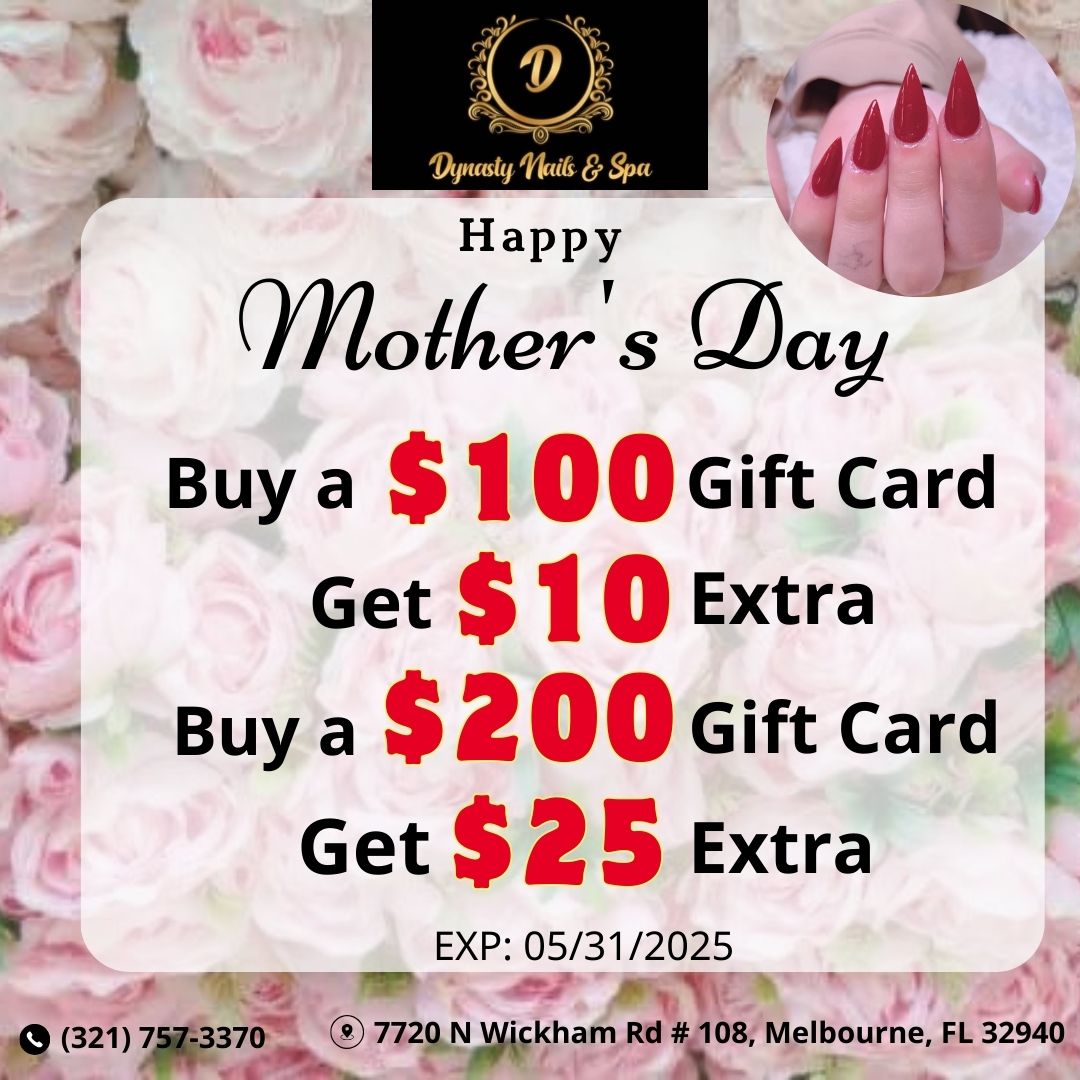 Dynasty Nails & Spa, located in Melbourne, FL 32940, is a nail salon that aims to enhance natural beauty and refresh customers' days. The salon offers various services, including manicures, pedicures, permanent makeup, skincare, and eyelash extensions. Customers consistently express their satisfaction with the excellent and trendy services provided. Many appreciate the clean and calming environment, noting that everything is always sanitized and very clean. The staff is known for their friendly, professional, and caring service, making guests feel special and comfortable. Ann is recognized for doing amazing pedicures and giving stellar service that addresses broken nails and leaves clients feeling pampered. Martha is known for her friendly demeanor and meticulous work, ensuring everyone feels well cared for. Customers have also praised the helpful and polite staff, with some mentioning how much they enjoyed the hospitality, laughter, and overall experience. The salon’s atmosphere is delightful, and the staff’s professionalism makes guests feel like royalty. Many customers say they will return soon, and some even wish they could take the staff home, highlighting the high level of satisfaction and the great service offered at Dynasty Nails & Spa.
