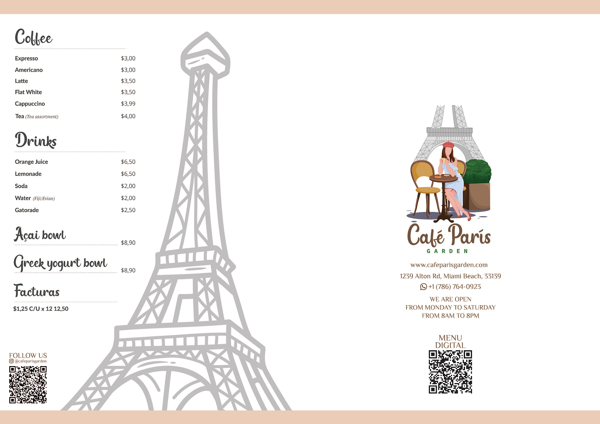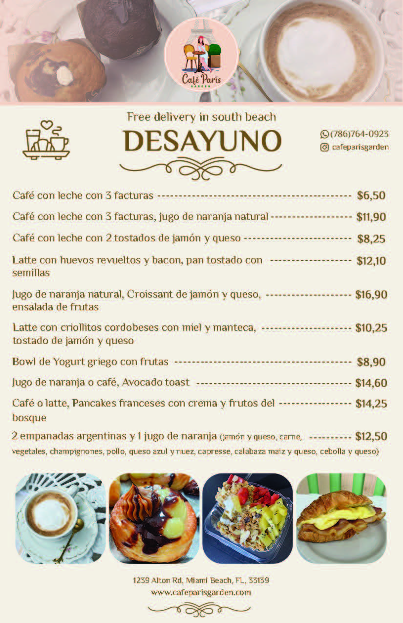 Cafe Paris Garden is a cafeteria and bakery in Miami Beach, FL. We specialize in top-quality homemade products with the added flavor from our chef. We have been a part of this community, putting smiles on people's faces and delicious desserts in their bellies. We focus on Argentine and European food and pastries with a high added value of culinary quality. We offer a variety of delicious cakes with different flavors to choose from. Our baked goods are handcrafted to perfection. We pride ourselves on the quality of our products.