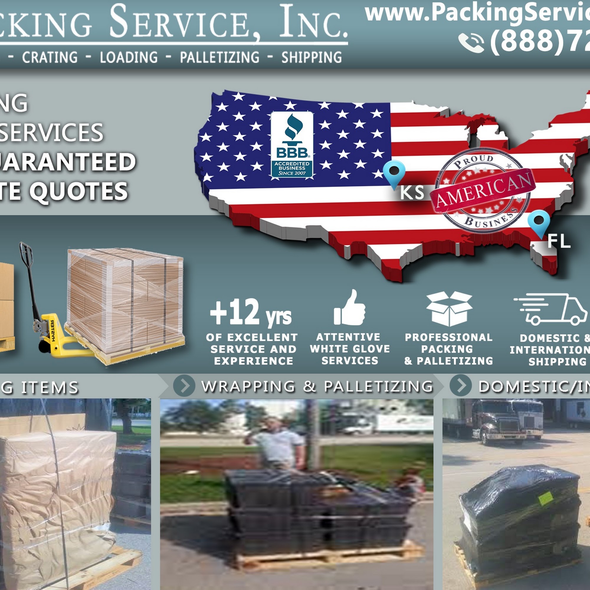 Packing Service, Inc. was established in 2003 and has been a member of the BBB since 2007, boasting a 97% customer satisfaction rate. The company combines the shipping and moving industries to provide exceptional customer service. PSI offers FLAT RATE GUARANTEED QUOTES for packing boxes, wrapping furniture, loading and unloading rental trucks, pods containers, international containers and trailers, building custom wooden crates, wrapping and palletizing boxes, furniture and machinery on-site, and shipping pallets and custom crates domestically and internationally. Customers praise the company's careful packing and loading, damage-free unloading, professional and friendly attitude, and overall anxiety-free moving experience. Packing Service, Inc. is known for its trustworthiness, dependability, and true care for the products being shipped.