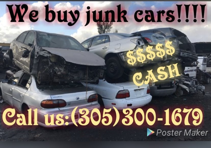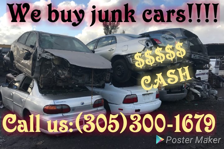 We are a company that specializes in picking up old and unhealthy cars, or no longer wanting and taking them to junkyard without paying a dollar. We pay cash at the moment and the estimate is free. Call now at 3053001679. We have over 10 years of experience and pay the highest prices in all of Florida. If you're from Miami, Hialeah, Broward, Hollywood, Opa Locka, we can help you, don't miss the opportunity to get a considerable amount of money for that car you no longer want