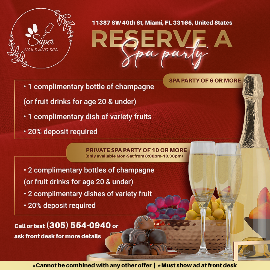 Super Nails & Spa is a nail salon in Miami, Florida, specializing in intricate nail designs. They offer a full range of nail treatments, including gels, acrylics, and dip powder. The salon prides itself on employing highly-skilled technicians who stay up-to-date on the latest trends. Clients describe the space as clean, spacious, bright, and tidy, making it a relaxing environment and a temple of relaxation. Customers have praised the salon's friendly, kind, and helpful staff, as well as the excellent quality of their work. The technicians can create wonderful designs, and the nails last a long time. They highlight the salon's affordable prices and convenient location with ample parking. The salon has a loyal customer base, with many customers returning for years and praising the consistent quality of service. The staff is always willing to accommodate customer requests and create custom designs, making each visit a personalized experience.