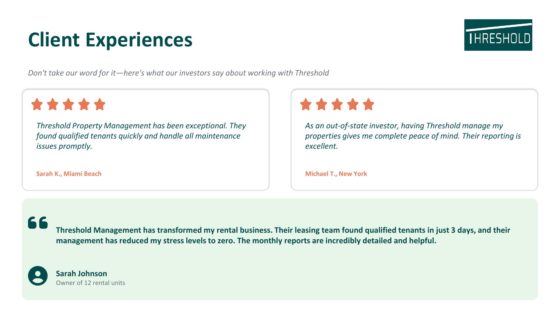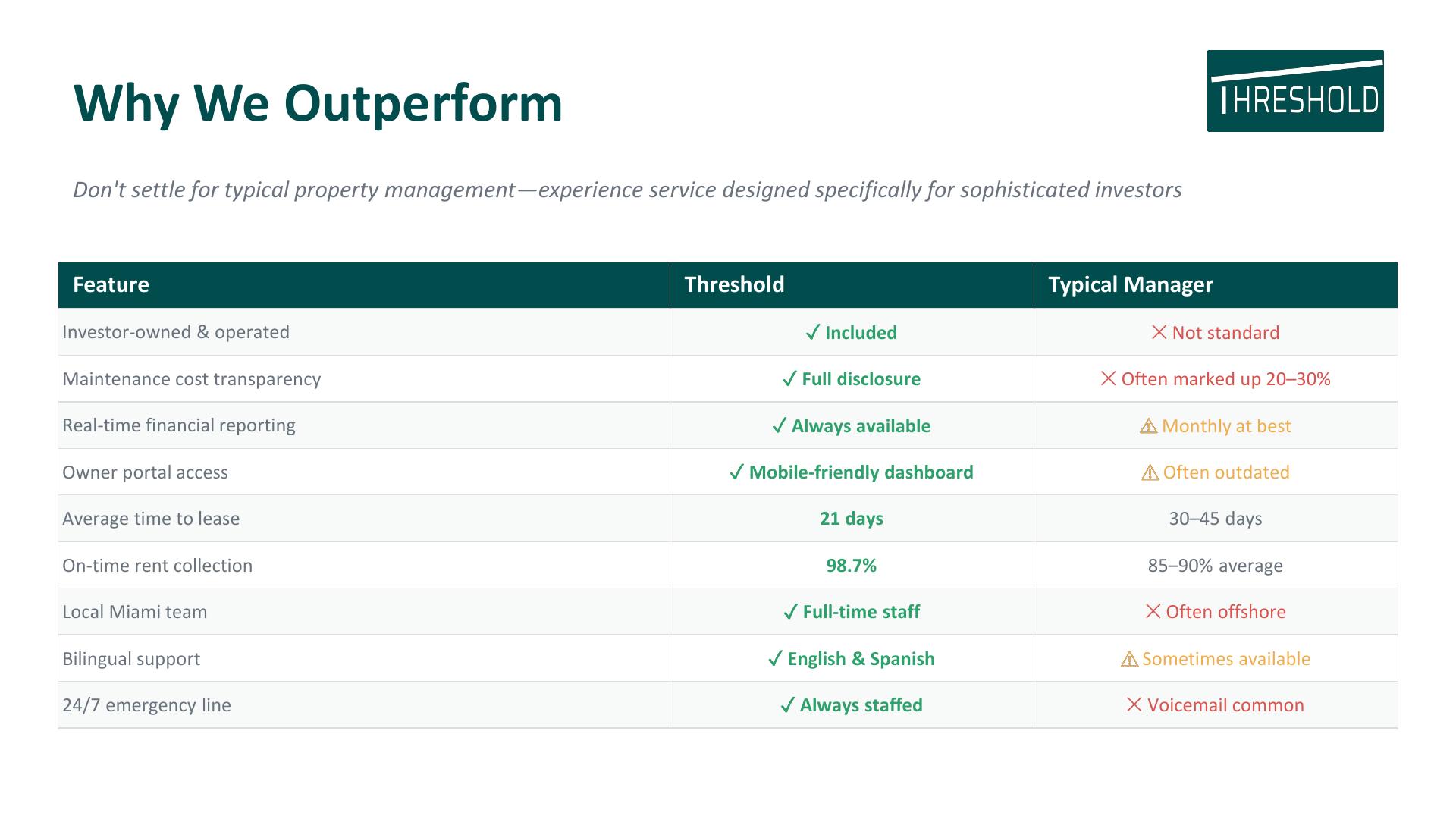 Threshold Management offers expert property management services in Miami and beyond, serving areas like Hollywood, Brickell, Coral Gables, Fort Lauderdale, and Wynwood. Whether you own single-family homes, condos, or apartment buildings, we deliver streamlined, tech-powered solutions that make managing rentals simple and stress-free. Built by investors, for investors, our team is committed to maximizing your returns with local expertise and powerful automation. Discover why we're the go-to for property management Miami trusts. Get a free quote today!